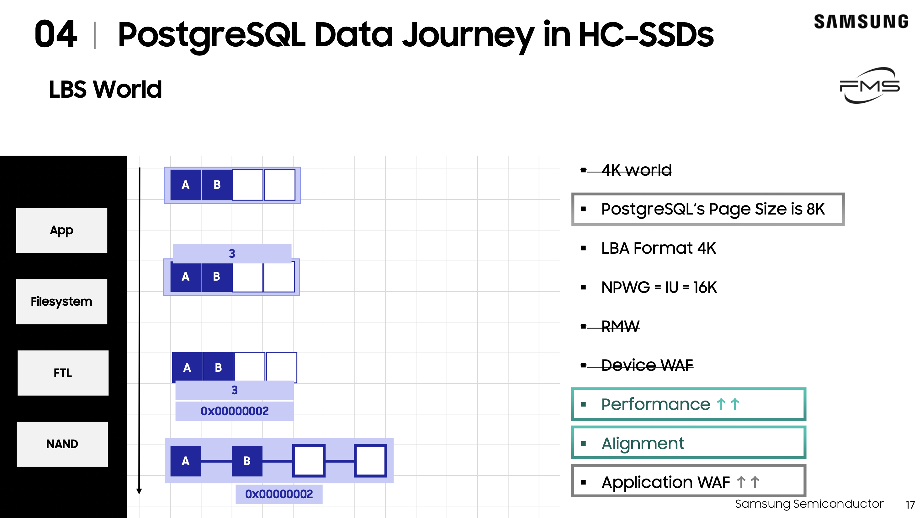 PostgreSQL 환경과 HC-SSD의 조합에 대해서 다루었습니다. HC-SSD의 특성 중 하나는 4k IU가 아니란 것인데, 이를 최근 도입된 LBS(Large Block Sizes)를 통해 SSD의 WAF를 줄이고 RMW 오버헤드를 줄여 해결할 수 있다는 것입니다.