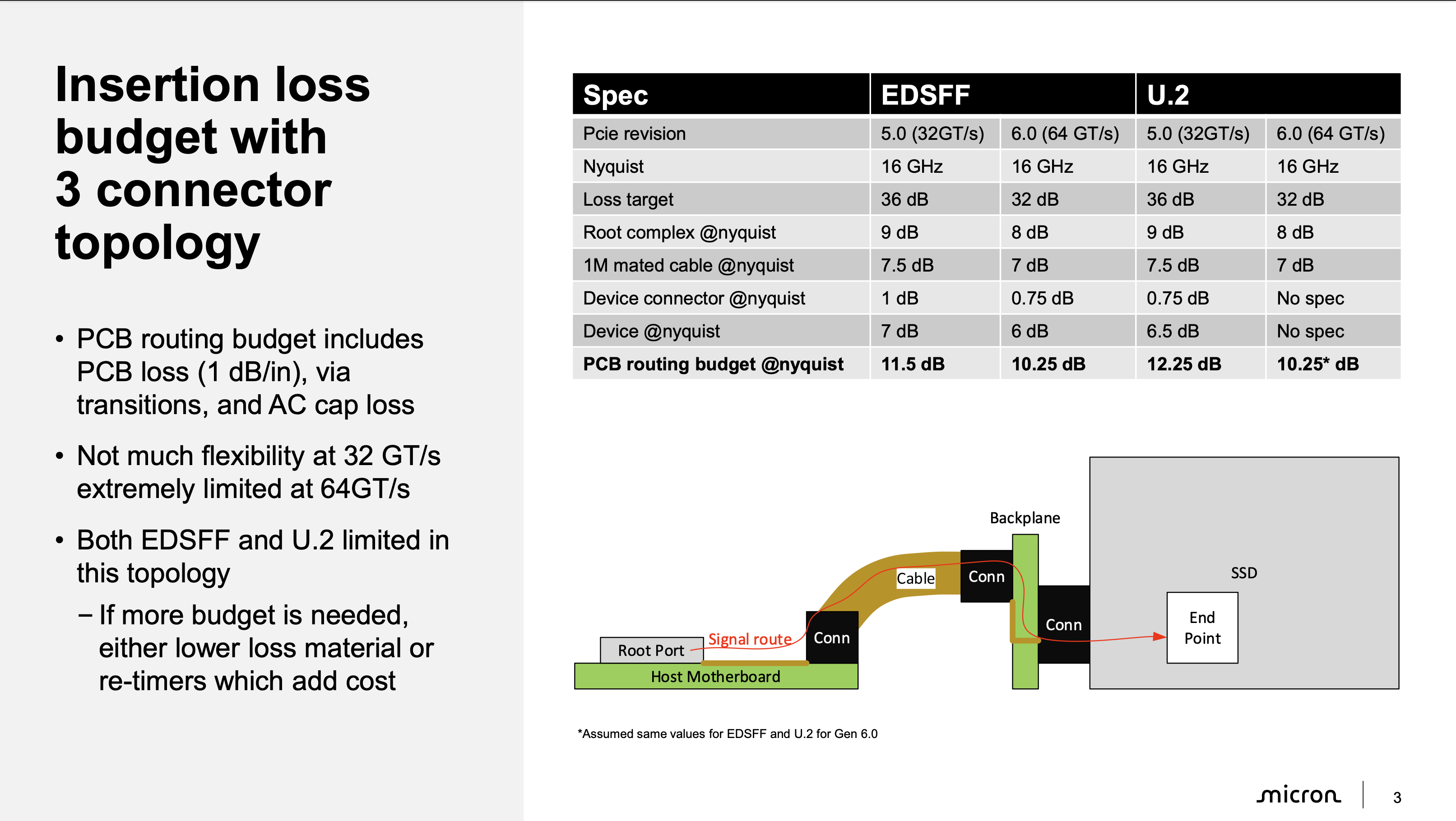 PCIe 5.0과 PCIe 6.0으로 넘어오며 신호는 굉장히 민감해졌습니다. 특히, 3-connector topology에선 어려움을 겪고있죠. 간단하게 U.2와 비교해 EDSFF의 장점을 나열해보면, card edge 방식의 채용으로 신호 전환의 지점이 적어, 무결성이 향상됩니다. 또한, U.2는 TX와 RX핀이 인접해있어 Crosstalk 문제가 발생합니다만, EDSFF는 그렇지 않죠.