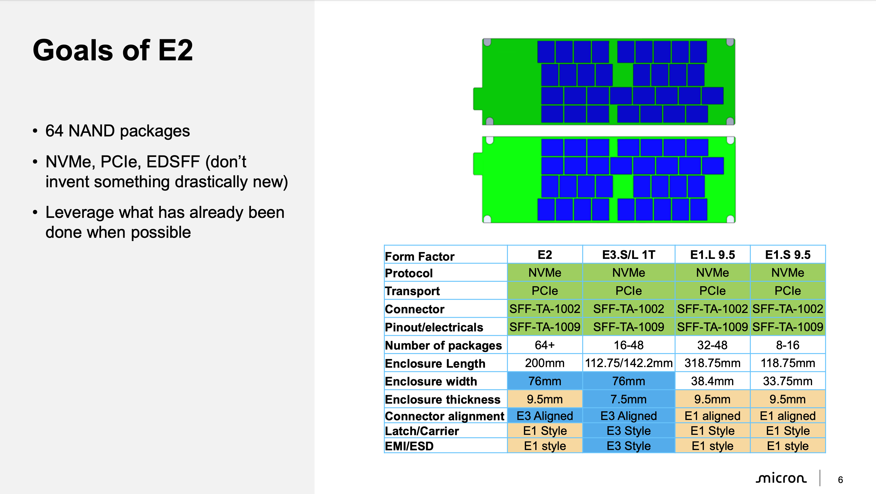 E2 폼팩터는 최대 64개의 NAND 패키지를 수용가능합니다. 예상할 수 있는대로, 고용량 SSD를 위한 폼팩터입니다. 현재, SNIA에서 SFF-TA-1042라는 이름으로 표준을 찾아볼 수 있습니다.