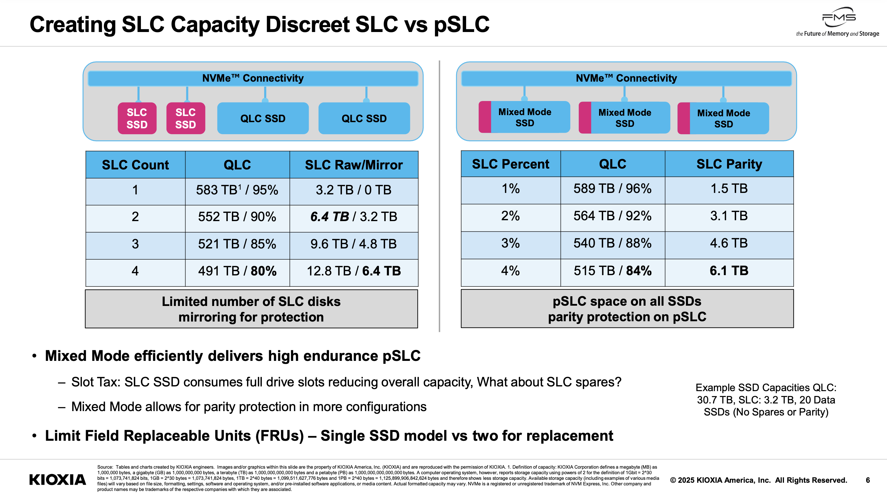 Kioxia가 좀 많죠? 마지막입니다. 개인적으로 기대했던 발표였습니다. QLC SSD 내부에 pSLC 영역을 만드는 것입니다. cSSD의 SLC 캐시와 똑같은 것 아니냐는 질문을 할 수도 있는데, 작동방식이 좀 다릅니다. 애초에 이쪽의 SLC 영역은 개별 네임스페이스로 성립합니다.