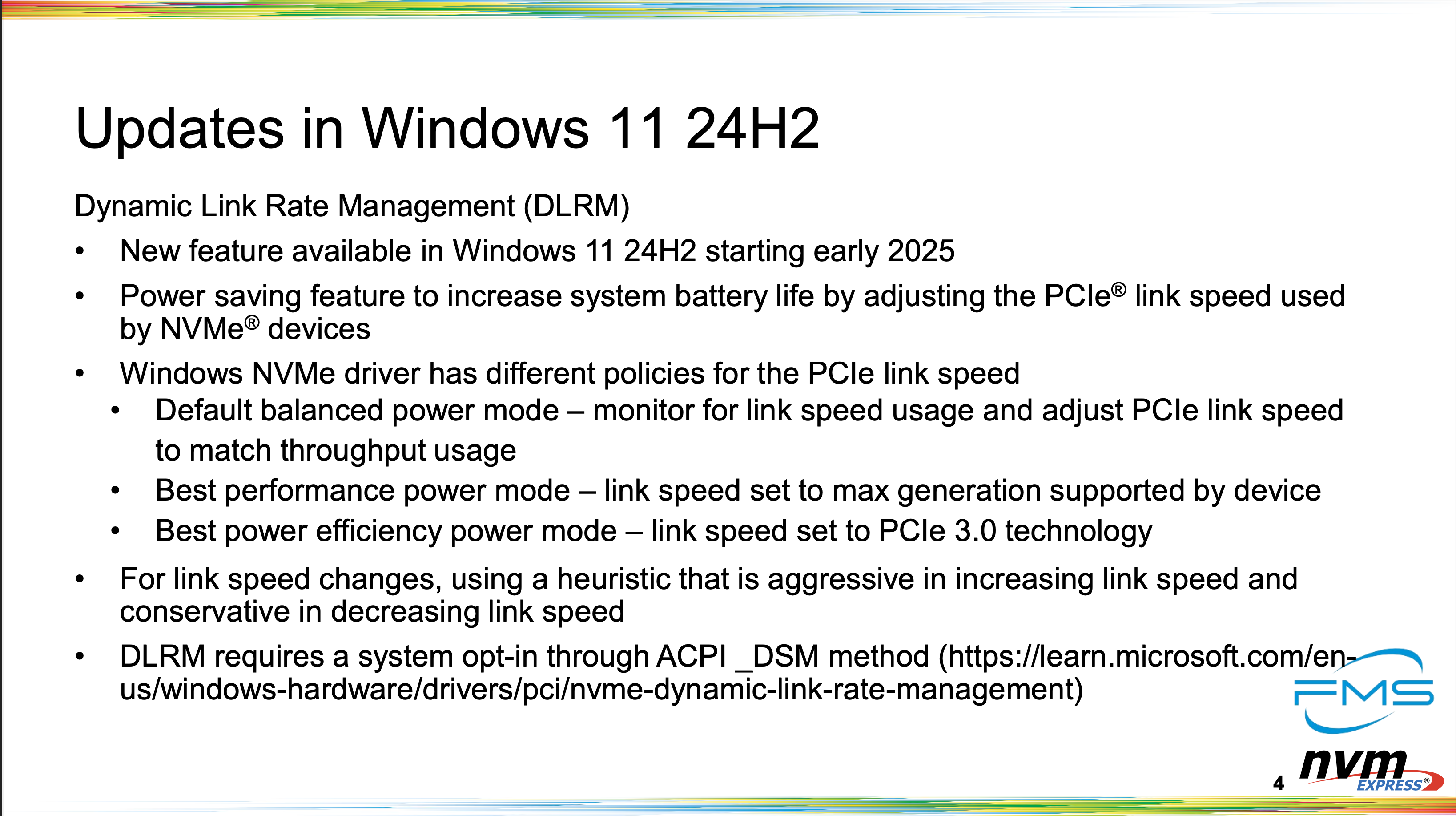 24H2부터 도입된 DLRM(Dynamic Link Rate Management)입니다. NVMe 드라이버는 3가지 모드를 지원하며, Default balanced power mode, Best performance power mode, Best power efficiency power mode가 있습니다. SanDisk의 ALSM과 상당히 비슷하죠?