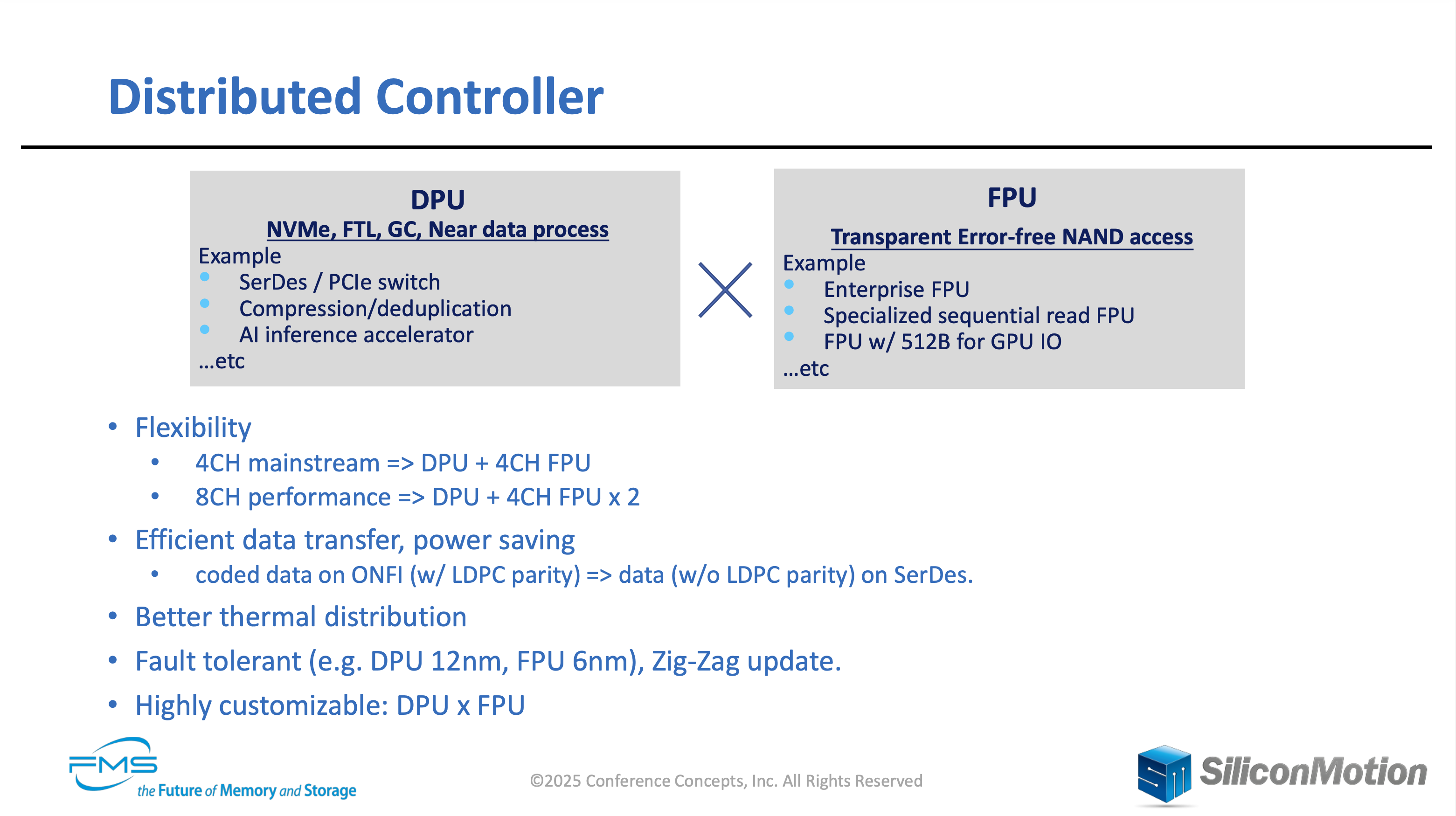 Silicon Motion은 분산형 컨트롤러의 디자인을 제안합니다. DPU와 FPU로 나뉘어진 디자인으로, FPU는 오류 재시도, 미디어 건강상태 관리를 맡으며, 소위 NAND의 "dirty works"를 처리한다고 합니다. 이외에도 물리 주소의 접근도 도와주는데, 자세한 역할의 분담은 제시한 슬라이드에 나와있습니다. 분산형 디자인으로 얻게되는 이점도 나와있는데, 유연성과 전력절감 등 많은 것을 확인할 수 있습니다. 슬라이드에는 나와있지 않지만, 신호 무결성 개선도 제시되었습니다.
