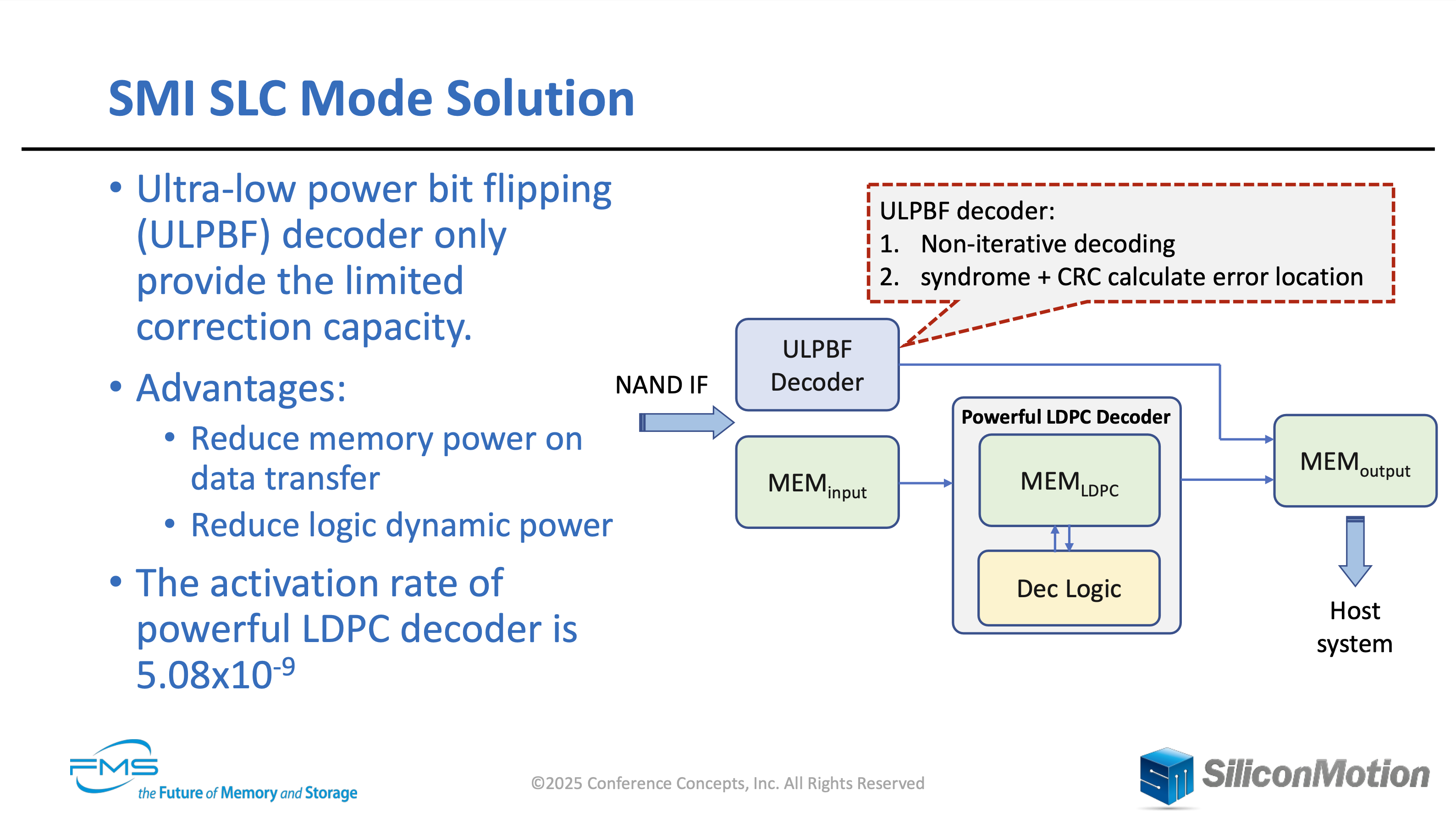 Silicon Motion은 여기서 ULPBF(Ultra-low power bit flipping) Decoder를 제시합니다. ULPBF Decoder는 LDPC Decoder에 비해 굉장히 제한적인 ECC를 수행할 수 있는데, SLC 모드에선 이 정도로 충분한 것이죠. 이러한 과정을 거치게되면 데이터의 입출력이 간소화되며, LDPC Decoder를 거칠 필요가 없으니까 소모되는 전력이 줄어듭니다. 발표에서는 Logic에서 33%, Memory에서 45%, 총 40%가 줄어든다고 주장합니다.