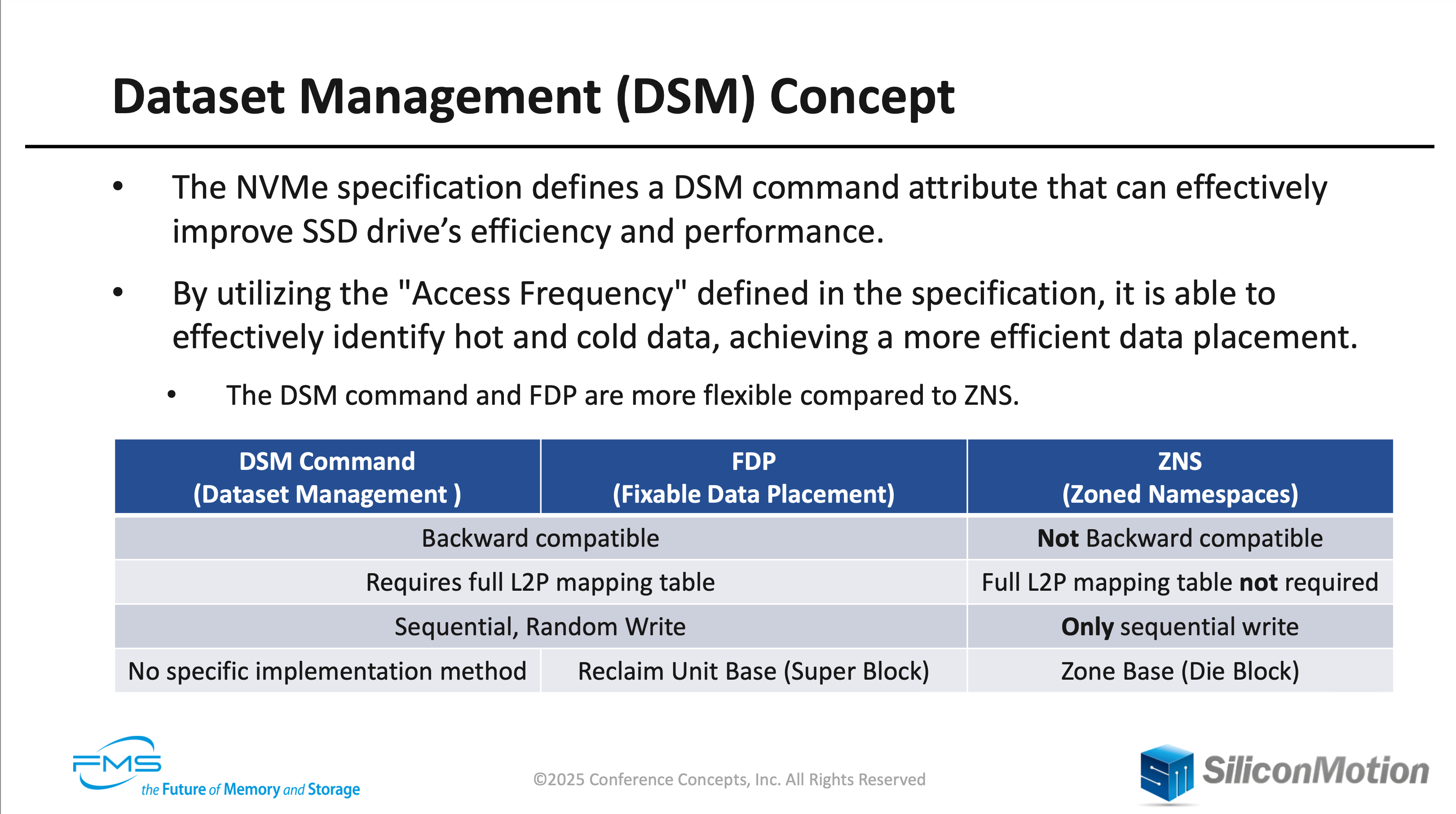 Windows 이야기를 할 때도 나왔던 DSM(Dataset Management)입니다. 이건 요약하기가 좀 애매하네요. 기존에 잘 알려진 ZNS, FDP와 비교한 표가 담긴 슬라이드를 첨부합니다.