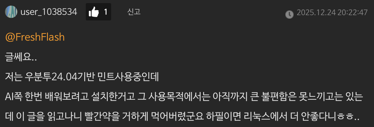 커뮤니티에 배포했던 리뷰에 user_1038534님께서 댓글을 남겨주셨습니다. Ubuntu 24.04를 기반으로 하는 Linux Mint를 사용하시는데, C910에서 저와 같은 오류는 없으셨던 것 같습니다.