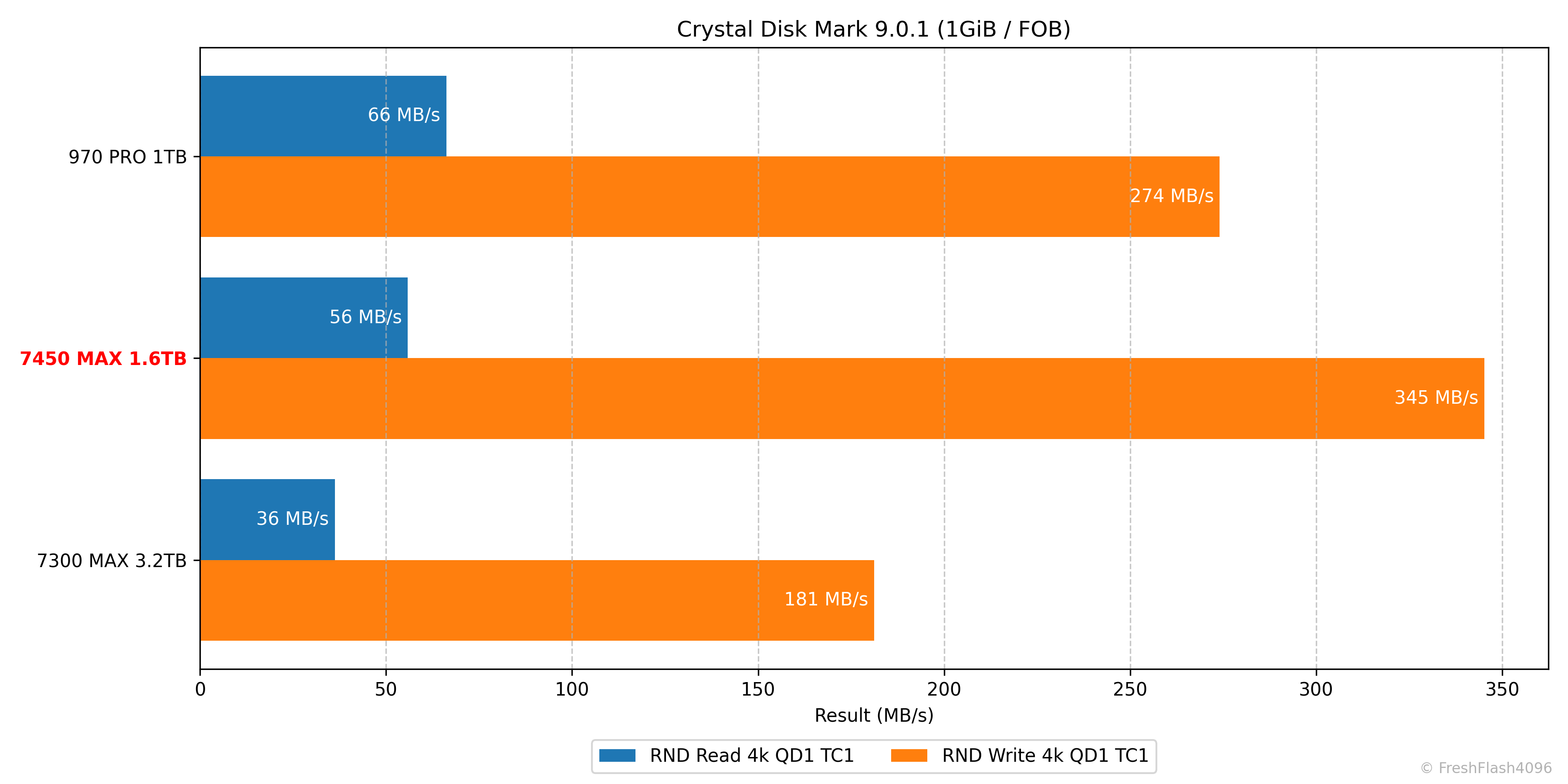 7450 MAX는 7300 MAX에 비해 성능 측면에서 개선을 이루었습니다. 일단, 후속작이니 당연한 일이라고도 할 수 있죠. 7300 MAX의 특징도 그대로 계승한 것처럼 보였습니다. 낮은 QD의 순차 읽기는 상당히 저성능이었으며, 랜덤 쓰기는 스펙시트를 크게 상회하였습니다.