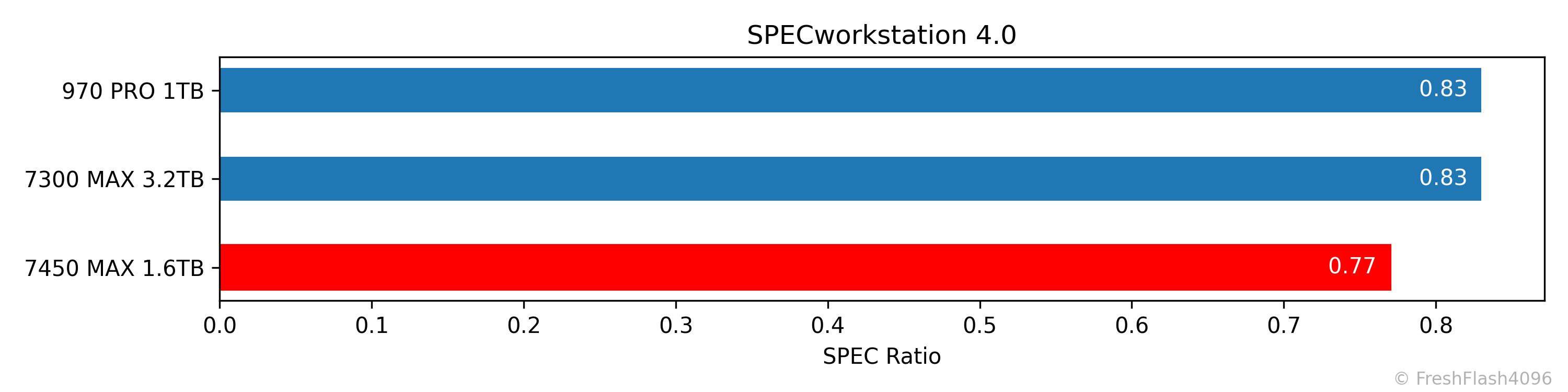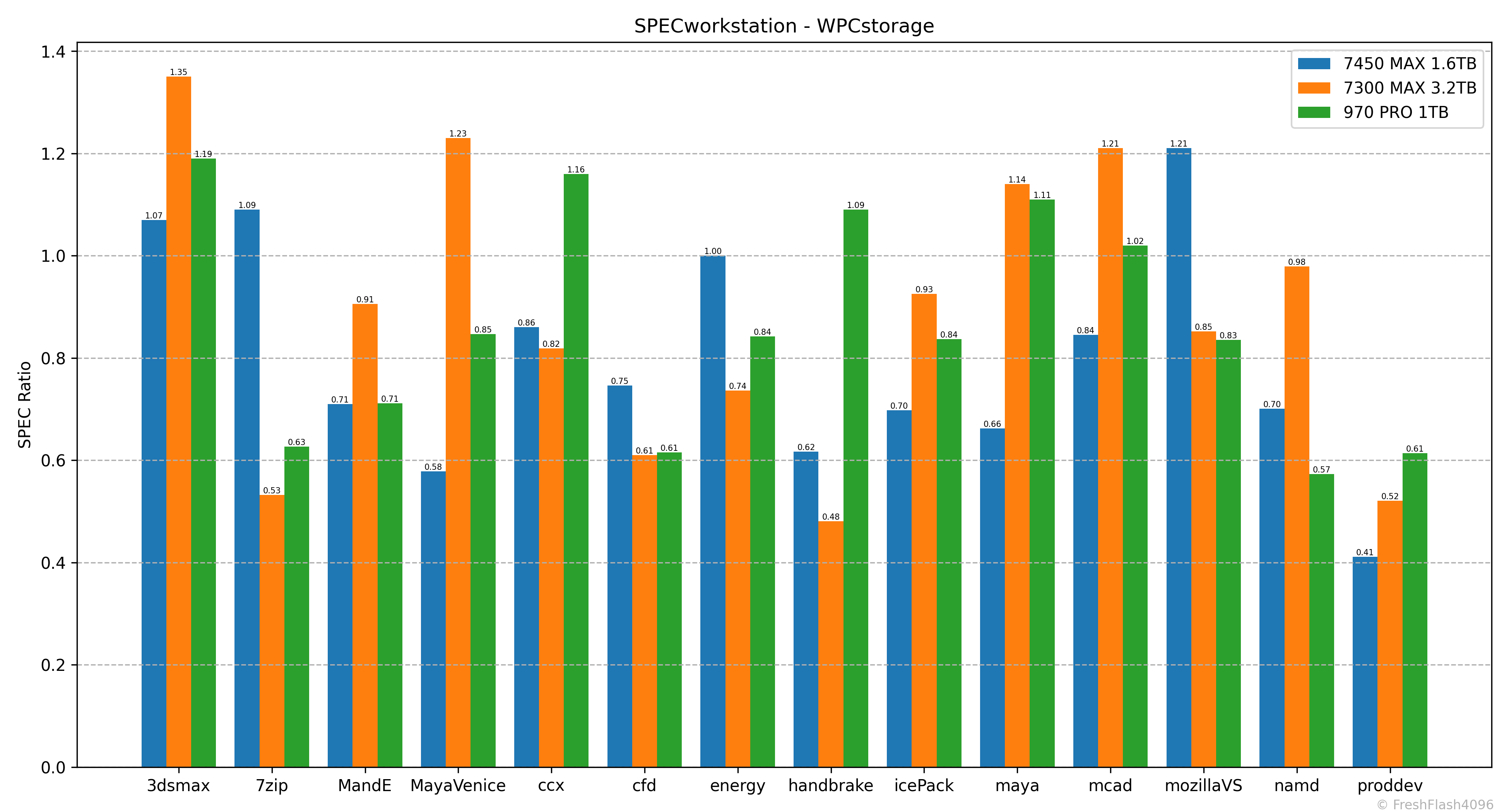 간단하게 끝내지 말고, 더 살펴보죠. MandE 워크로드에서는 7450 MAX와 970 PRO의 성능이 유사했지만, 7300 MAX가 독보적이었으며, maya 워크로드에서는 7300 MAX와 970 PRO의 성능이 유사하고 7450 MAX가 가장 뒤떨어졌습니다.