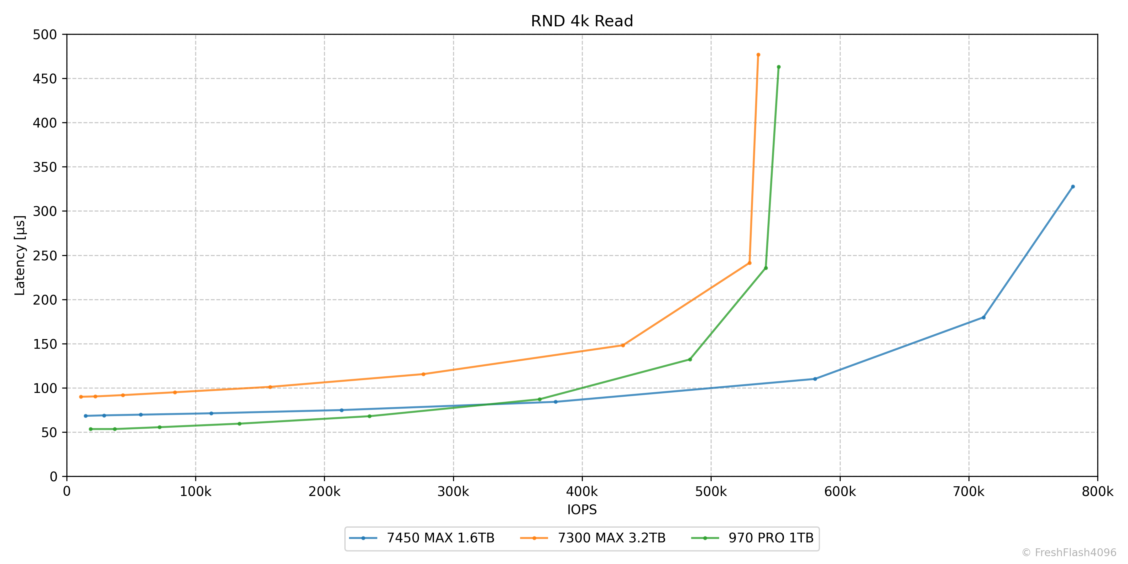 랜덤 읽기는 모든 구간에서 7300 MAX보다 우수하였으며, QD32 이후로는 970 PRO보다 우수한 모습도 보였습니다. 하지만, 스펙 시트의 800k IOPS와 다르게 측정된 평균값은 781k IOPS였습니다. 양쪽 모두 QD256 환경이며, 측정된 값의 최대치도 791k IOPS로, 스펙시트에는 도달하지 못하였습니다.