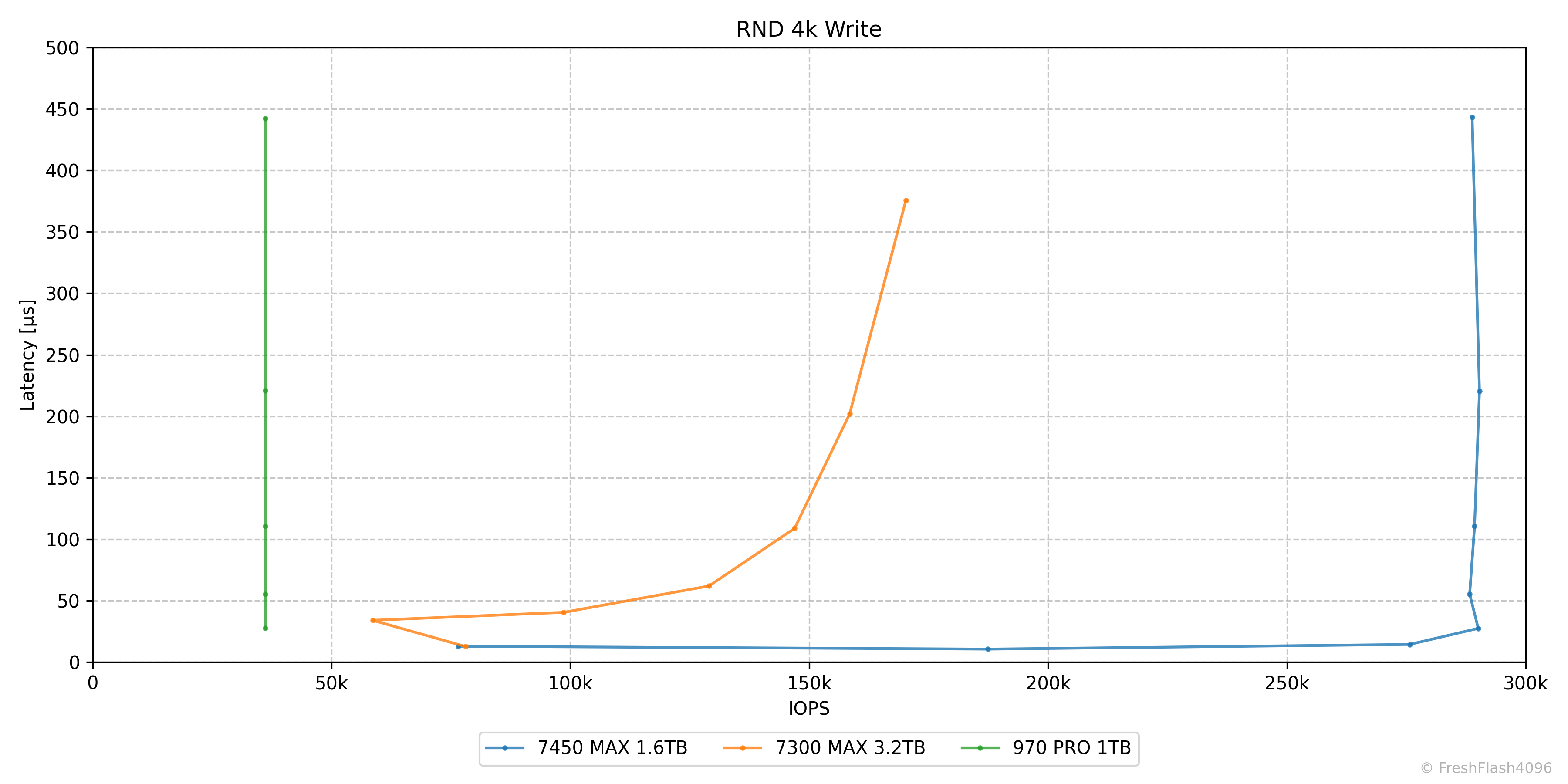 랜덤 쓰기는 7300 MAX가 스펙시트를 훨씬 상회하는 값으로 놀라움을 주었습니다. 7450 MAX도 이에 질세라 스펙시트의 250k IOPS를 QD8 환경에서 290k IOPS로 상당히 상회하는 모습을 보여주었습니다.