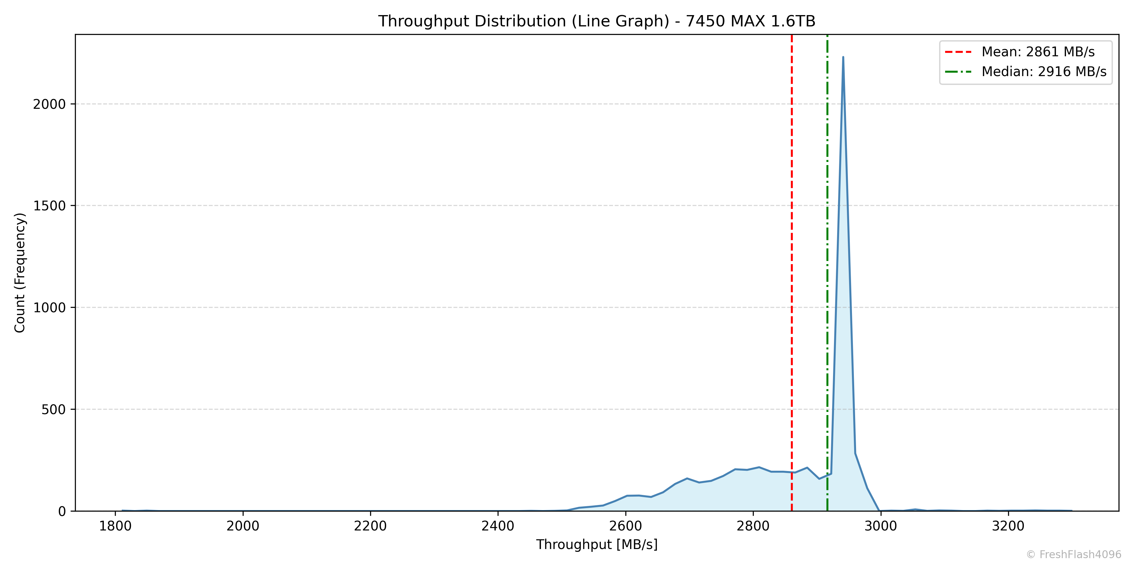 1회차 Fill Drive를 시간 축을 이용해 나타냈습니다. 가장 높은 빈도로 나타난 포인트는 2949MB/s 였으며, 그보다 위쪽은 평균적으로 2956MB/s가 계산되었습니다. 아래쪽에서는 일부 이상치로 간주할 수 있는 포인트를 제외하고는 평균적으로 2793MB/s를 보였습니다.