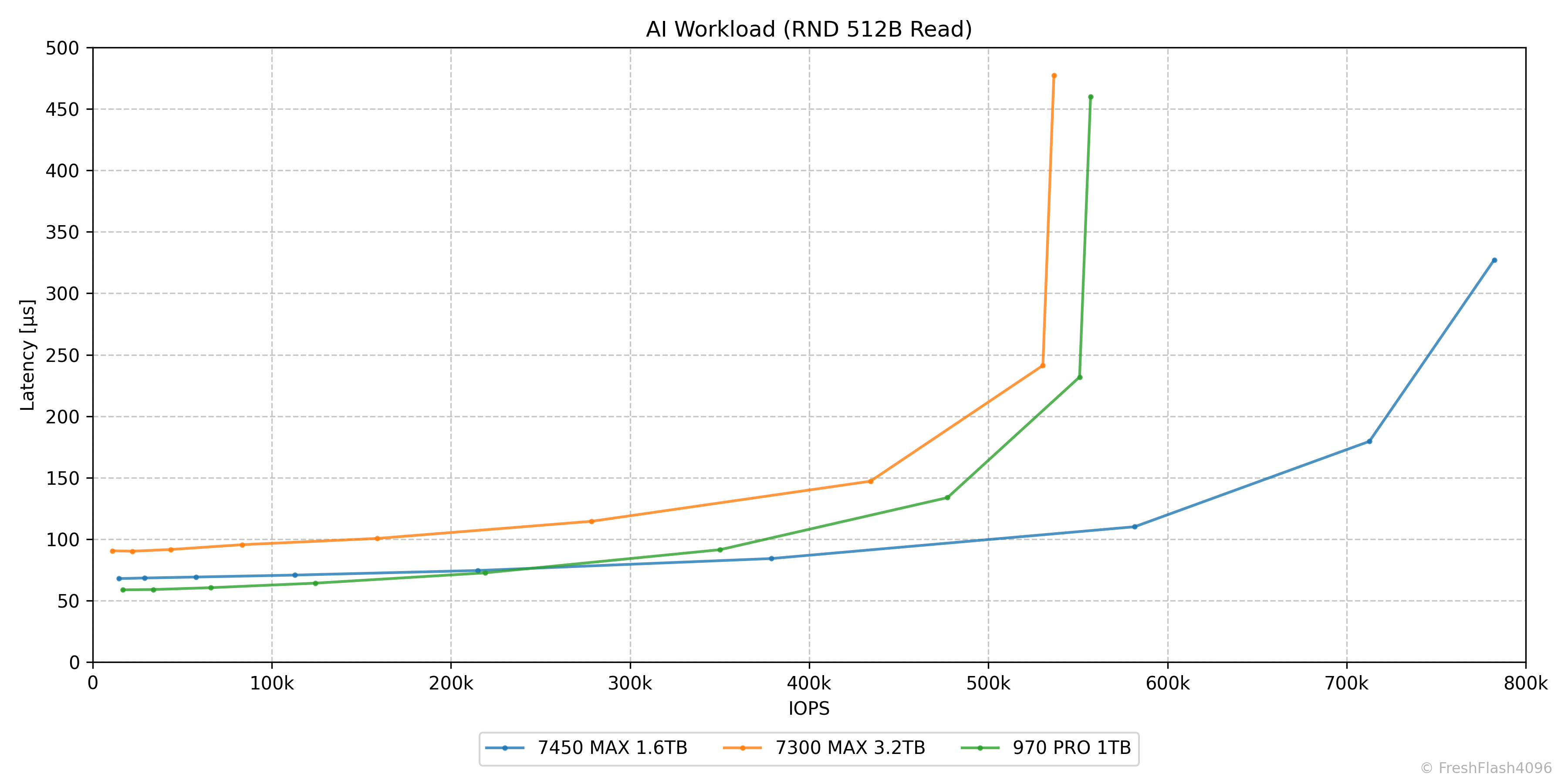 AI 워크로드는 QD256에서 782k IOPS가 측정되었는데, RND 4k Read와 크게 차이 나지 않는 수치입니다. 대부분의 SSD는 차이가 나지 않지만요.