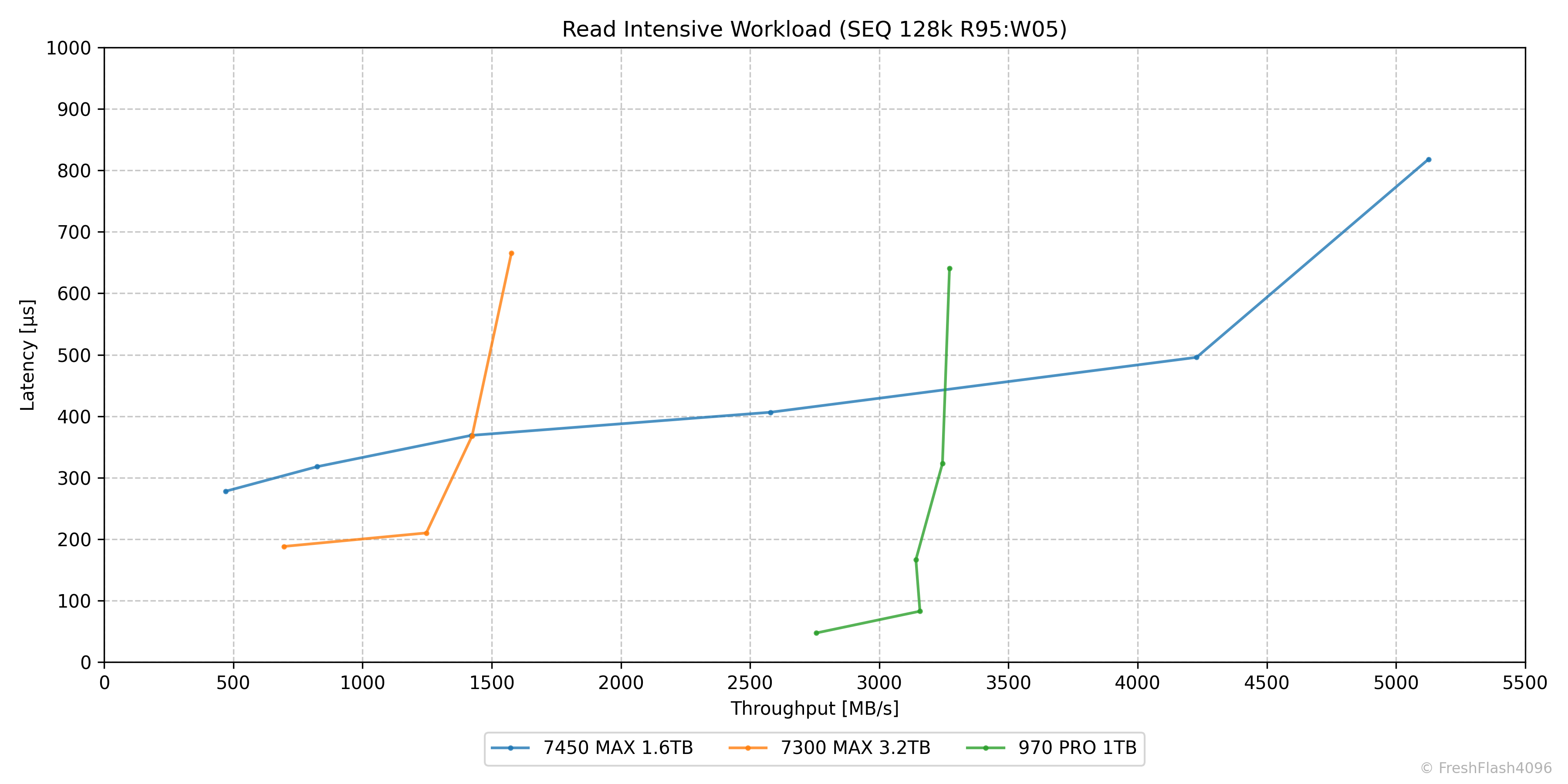 Read Intensive 워크로드는 QD32에서 5125MB/s가 측정되었습니다. 순차 읽기와 마찬가지로 QD64가 5336MB/s로 더 높은 Throughput을 보여주었으나, 평균 지연시간 1.6ms, 50% 지연시간 1.4ms로 그래프에 포함되진 않았습니다.