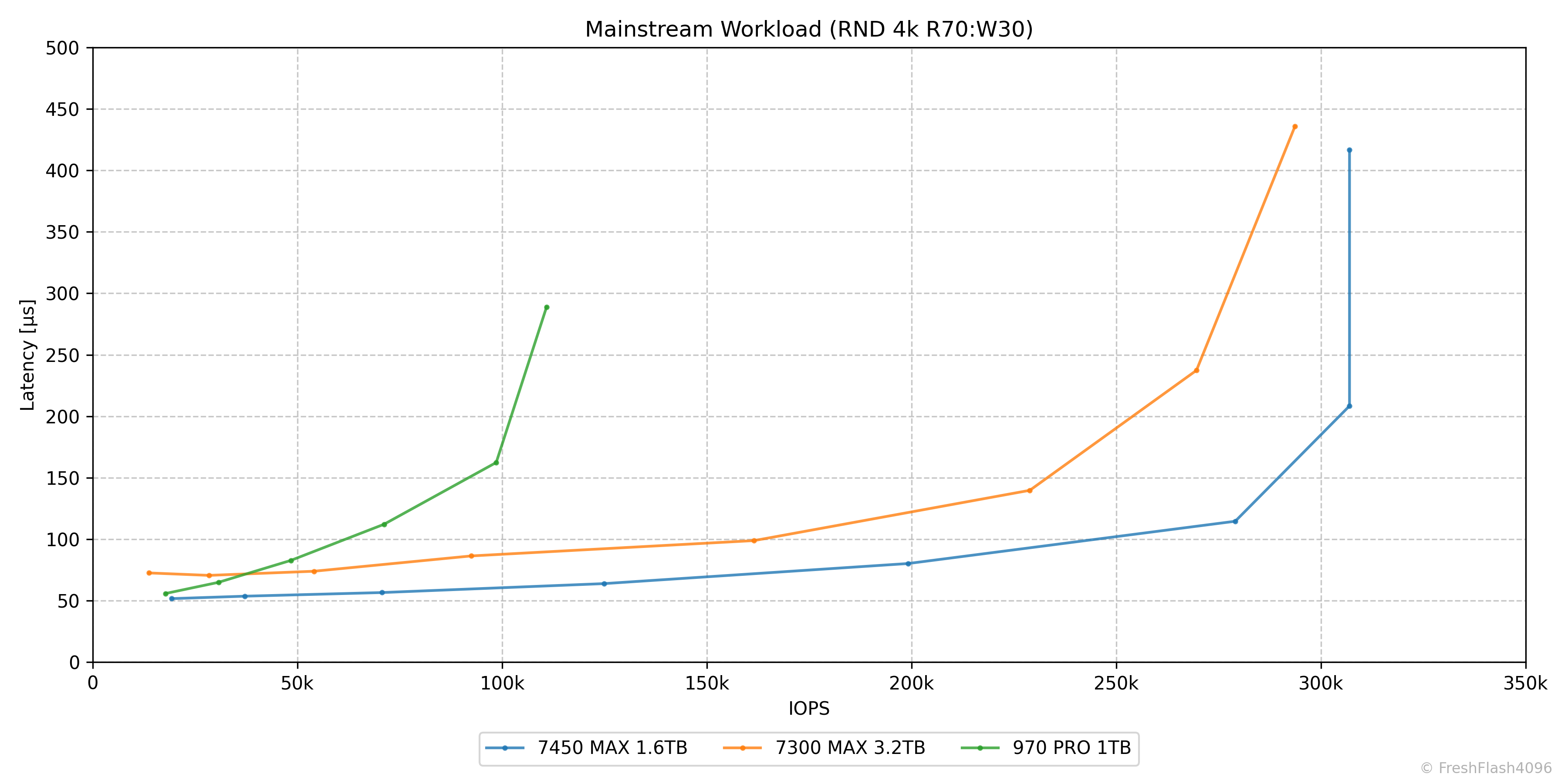 Mainstream 워크로드는 처음부터 끝까지 비교군 중 가장 우수했으며, QD64에서 307k IOPS가 측정되었습니다. 스펙 시트에는 290k IOPS가 기입되어있던 것을 생각하면 초과하는 값입니다.