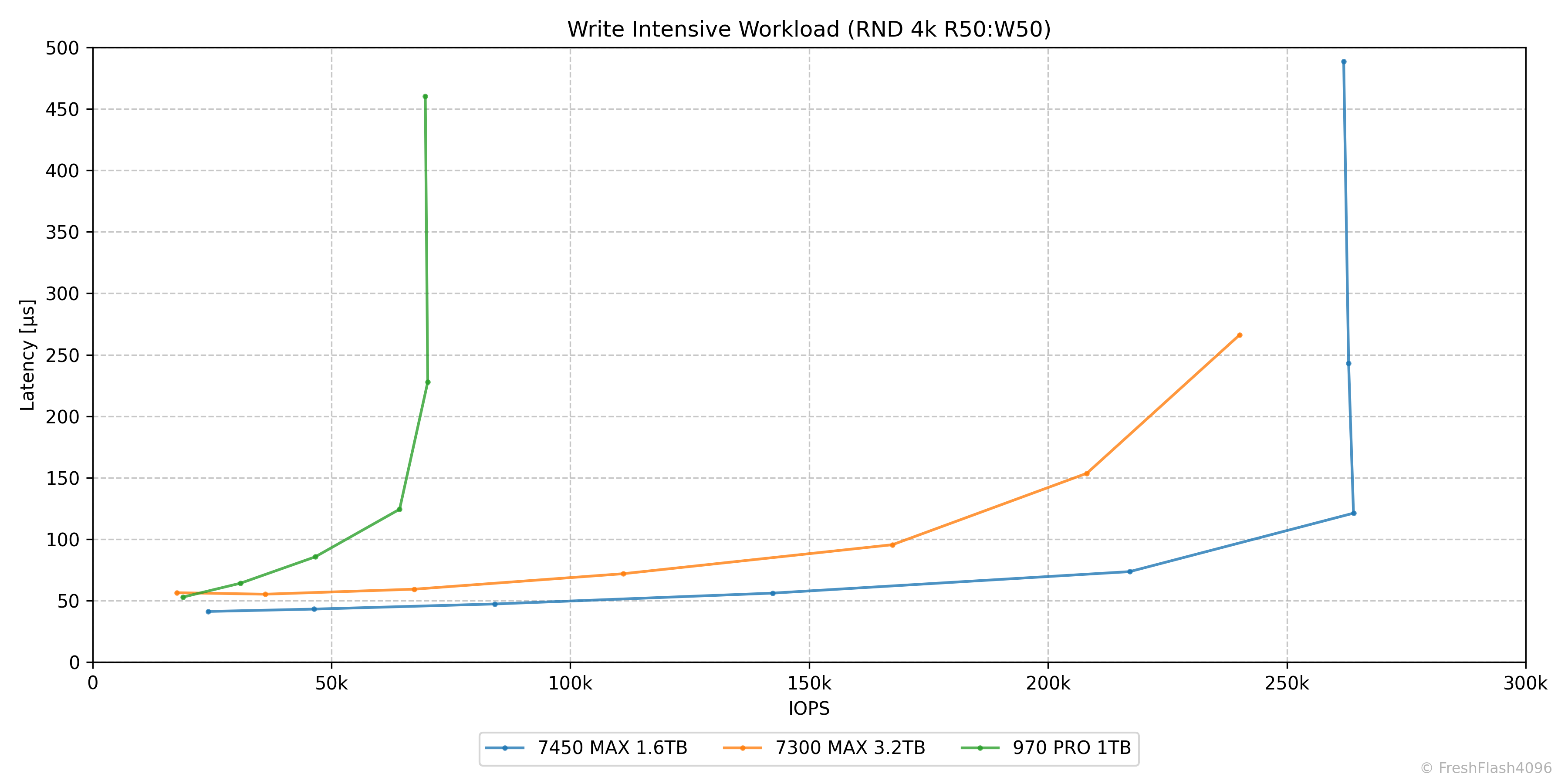 Write Intensive 워크로드도 비교군 중 가장 우수했으며, QD32에서 264k IOPS가 측정되었습니다.