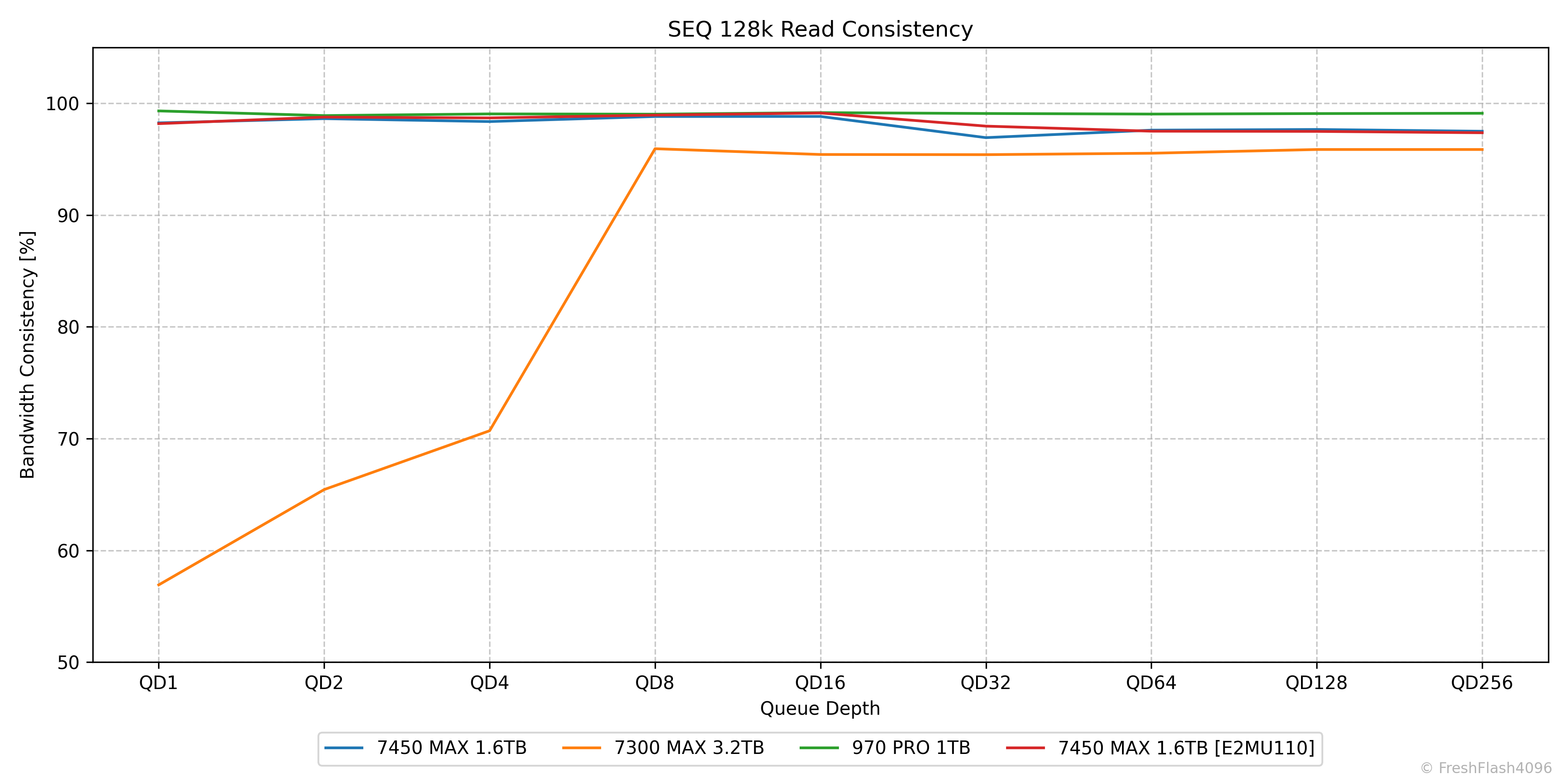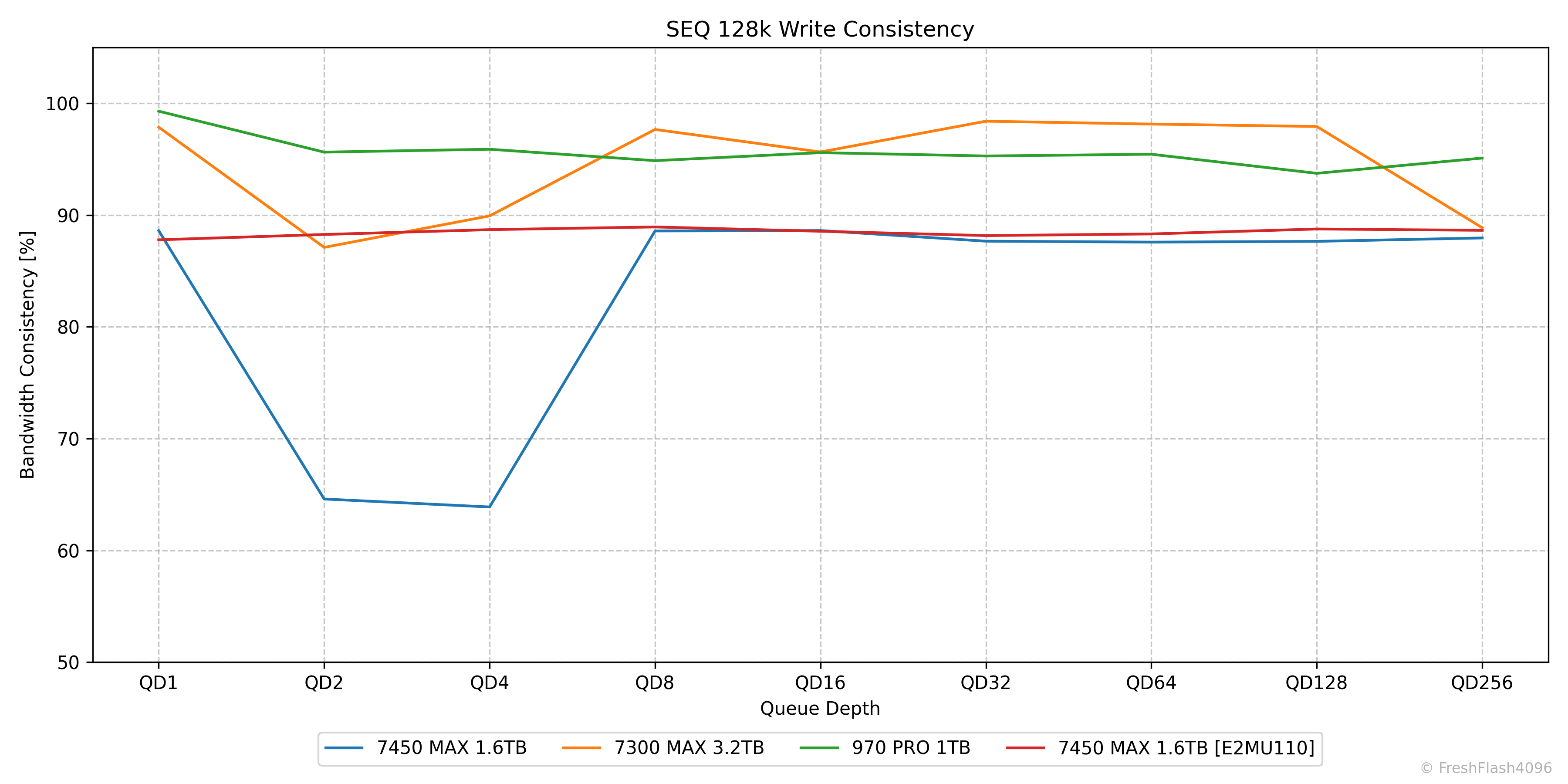 특이한 점은, 초기 펌웨어인 E2MU110에서는 QD2와 QD4에서 Consistency의 하락이 발견되지 않았다는 것 입니다. 초기와 최신 펌웨어의 유일한 성능 지표 차이는 이 순차 쓰기의 일관성에서 발생했습니다.