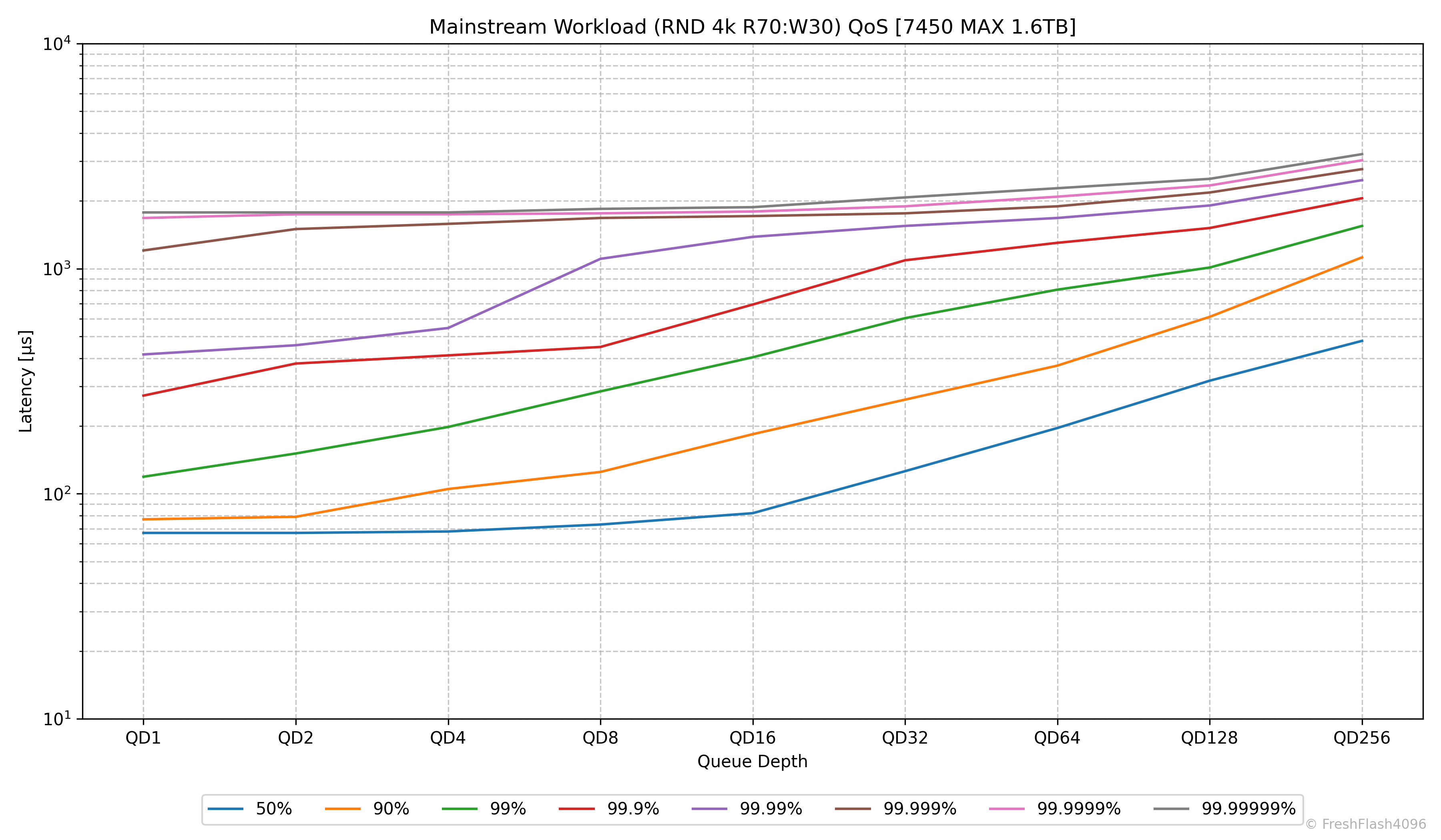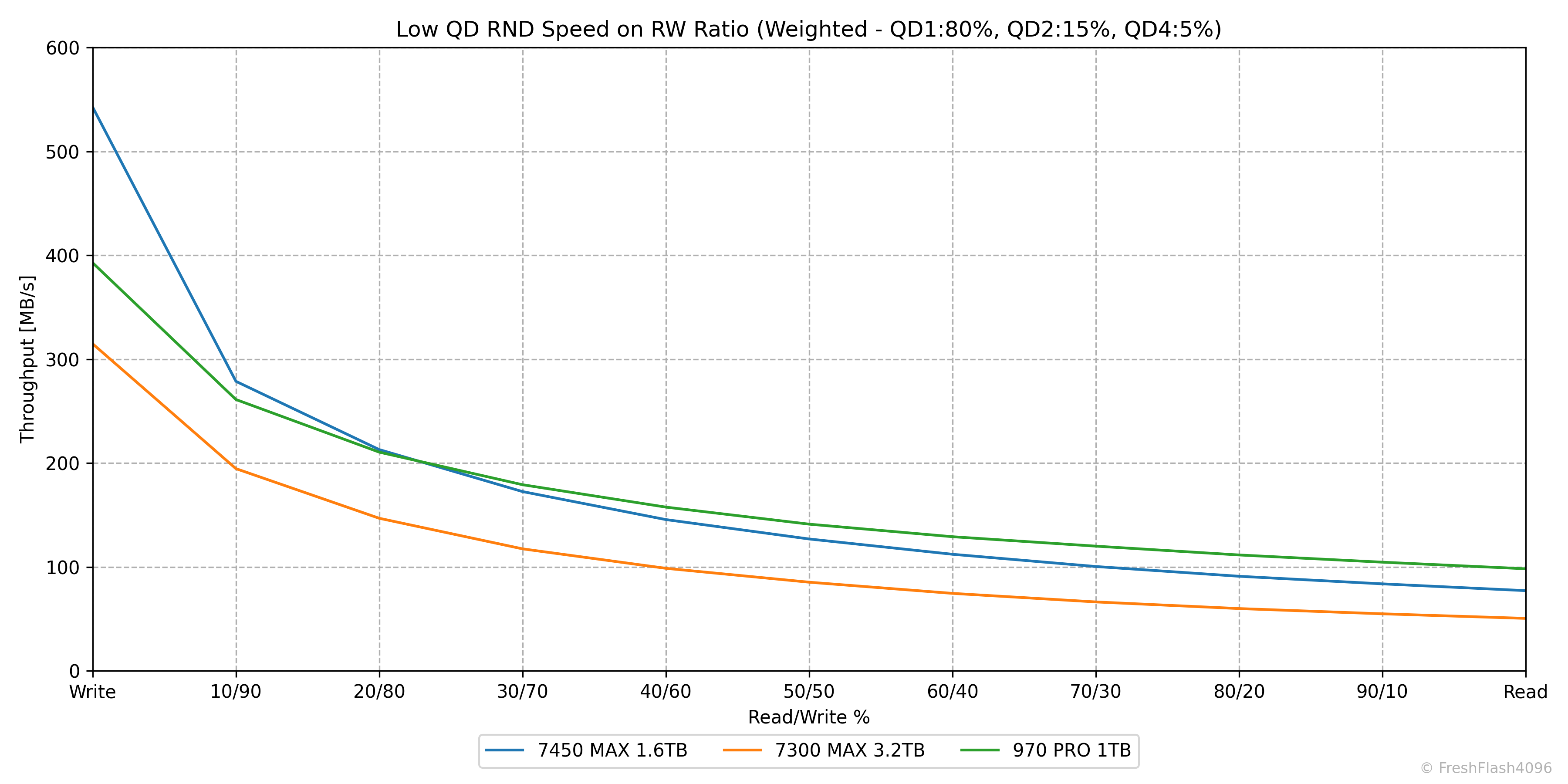 가벼운 쓰기와 TRIM이 진행될 때, 7450 MAX는 상당한 읽기 성능을 발휘합니다. 물론, 이는 QD256에서 측정되었습니다.