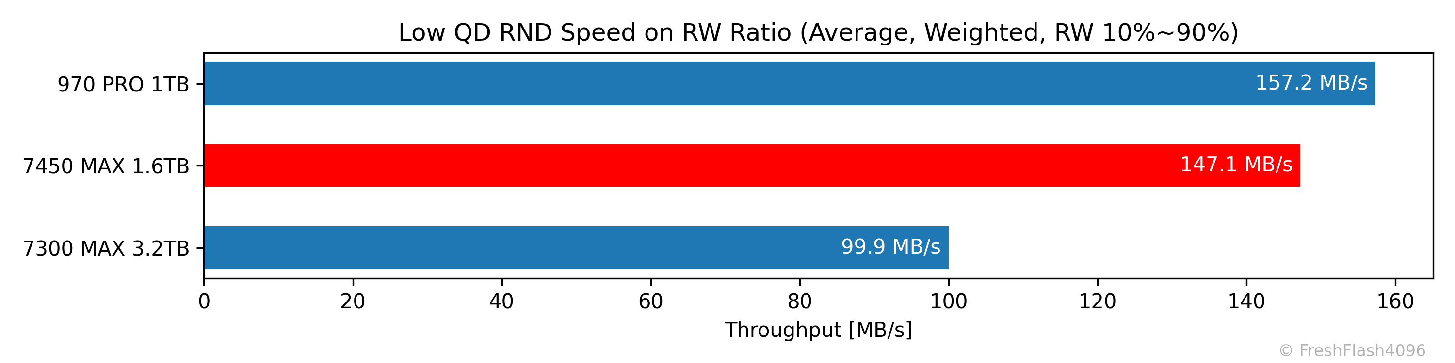 QD1에서의 RND 4k Read를 제외하고는 모두 7450 MAX가 가장 우수했습니다. 특히, 7300 MAX에 비해 저용량임에도 불구하고 모든 부하에서 앞지르고 있는 것은 나름 만족스럽네요.