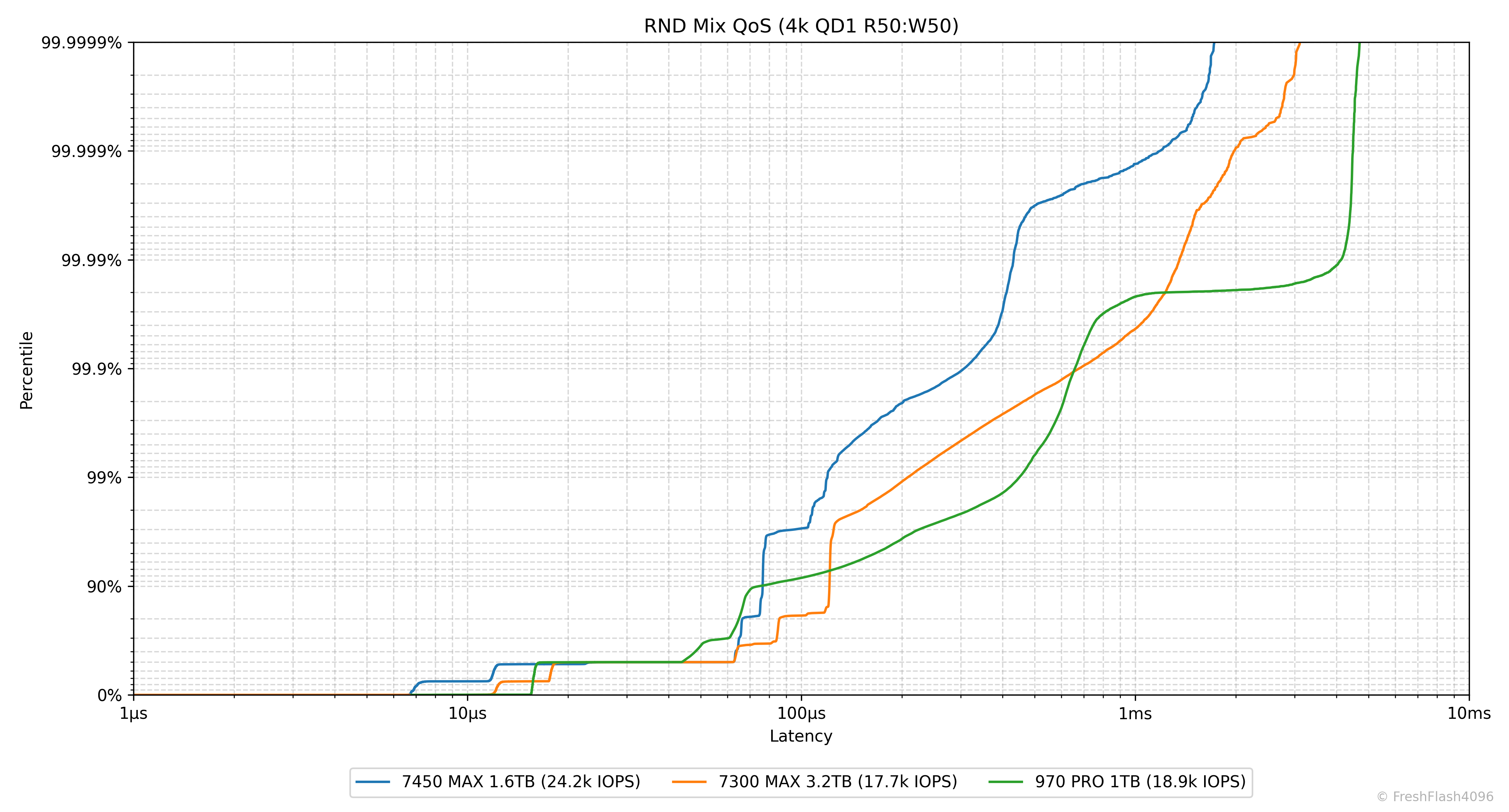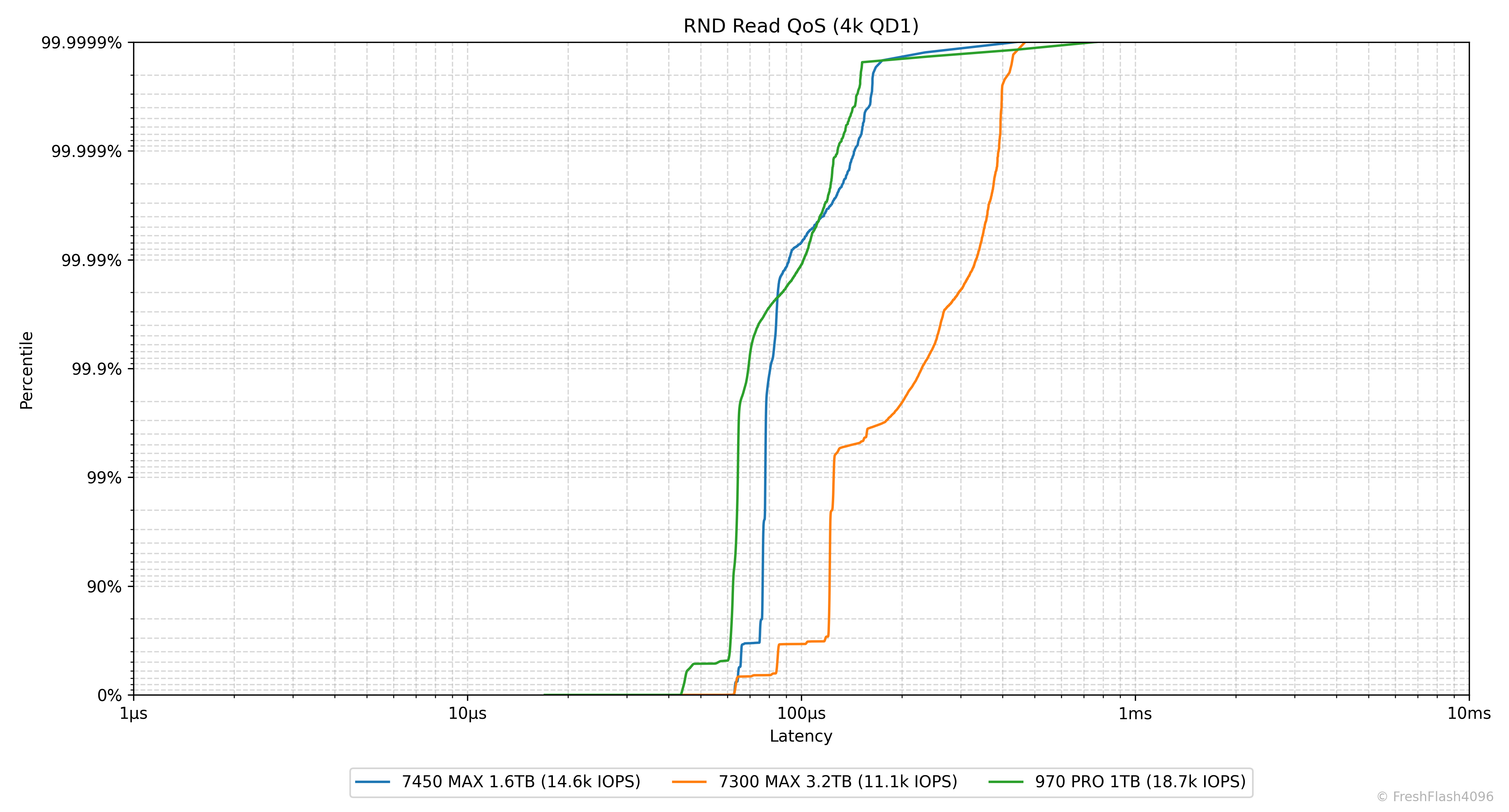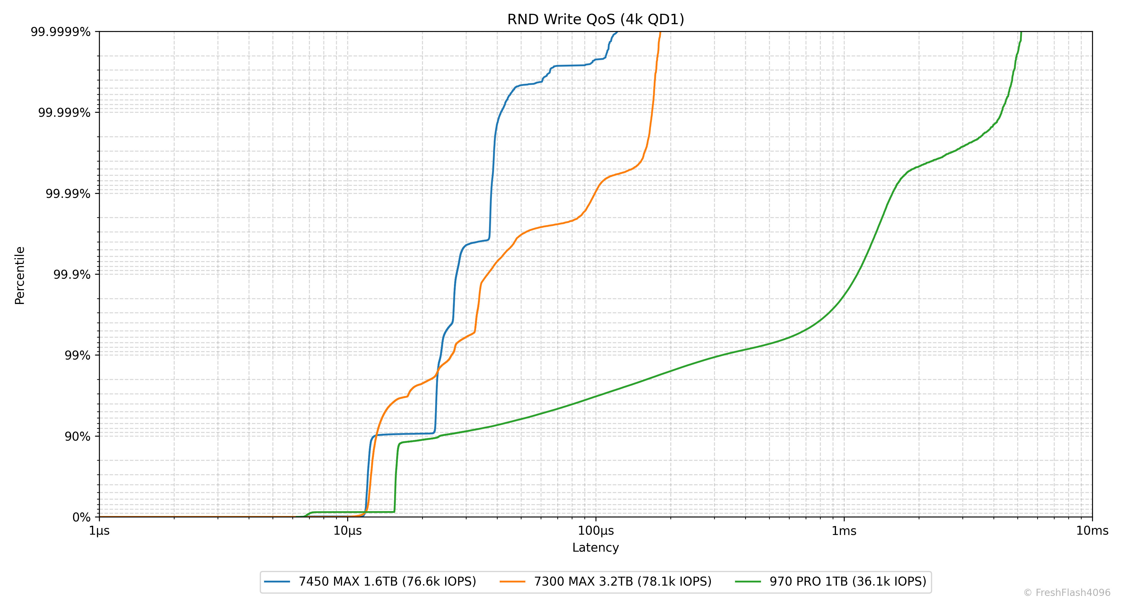 특히, 랜덤 쓰기의 99% 지연시간은 너무 우수하여 다른 리뷰와 비교해 보려고 검색을 시도했지만, QoS에 대한 분석은 진행하지 않는 TweakTown의 7450 PRO 리뷰만 찾을 수 있었습니다. Pre Conditioning 그래프에서의 분산만 보고 QoS가 우수하다고 평가하는 것은 아쉽네요.