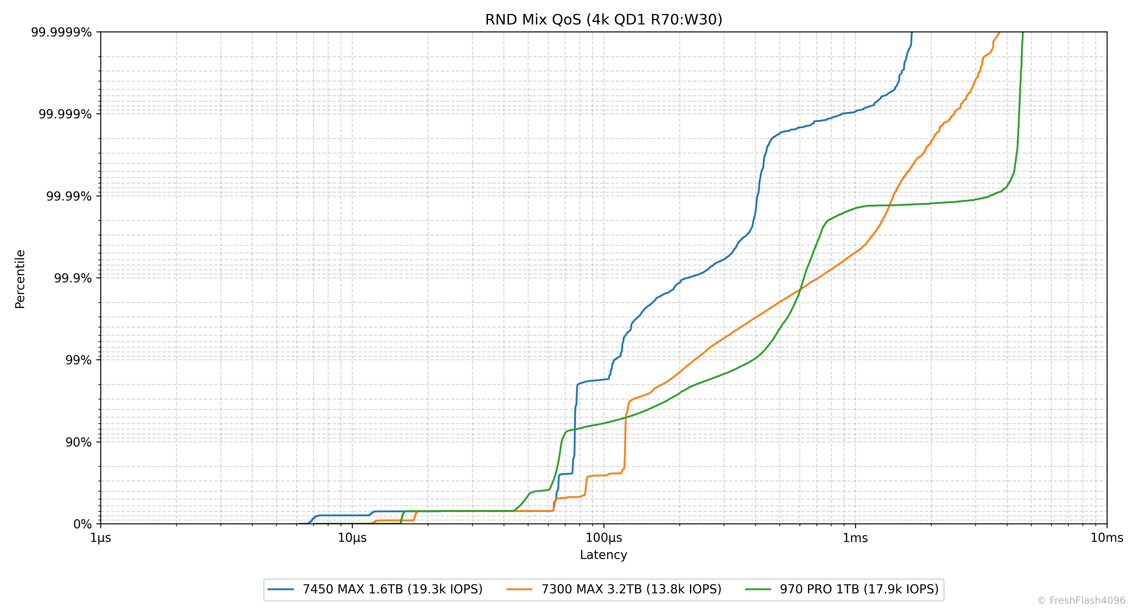 7300 MAX에 비하면 모든 위치에서 우위이지만, 970 PRO와 비교하면 쓰기에 가까울 때를 제외하고는 밀리는 모습입니다.