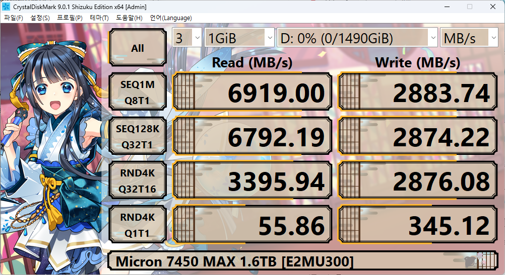 Windows에서 인식하는 용량은 1490GiB임을 확인할 수 있습니다. 높은 QD의 랜덤쓰기는 순차쓰기와 동일함도 확인할 수 있었습니다.