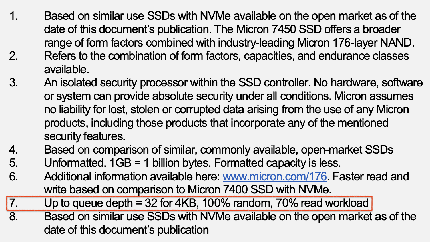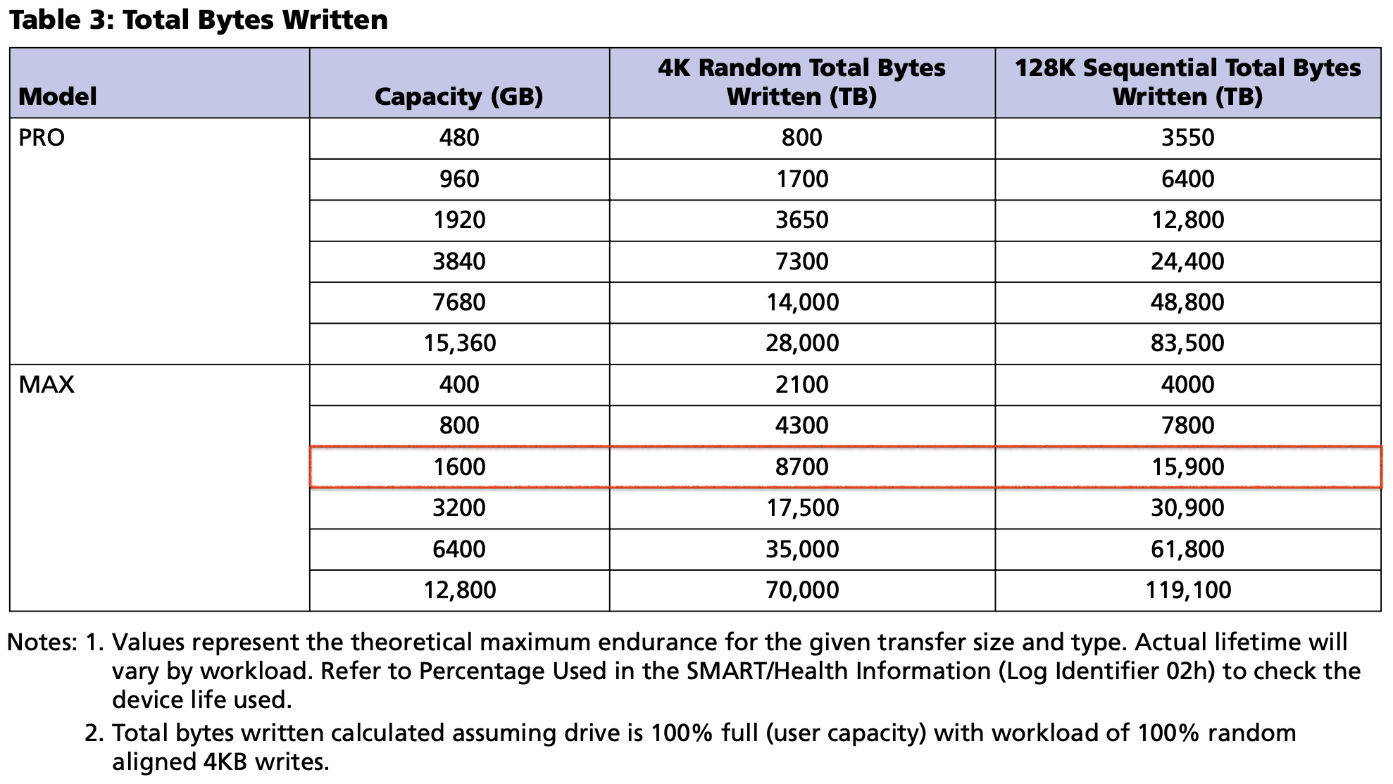 실제로 JESD219에서 명시된 엔터프라이즈 워크로드는 67%가 4k 크기로 이루어져 있으니, 큰 차이가 없을 수도 있겠습니다만, 7450이 특이했던 부분은 순차 128k 쓰기에 대한 TBW도 다루고 있다는 점입니다.