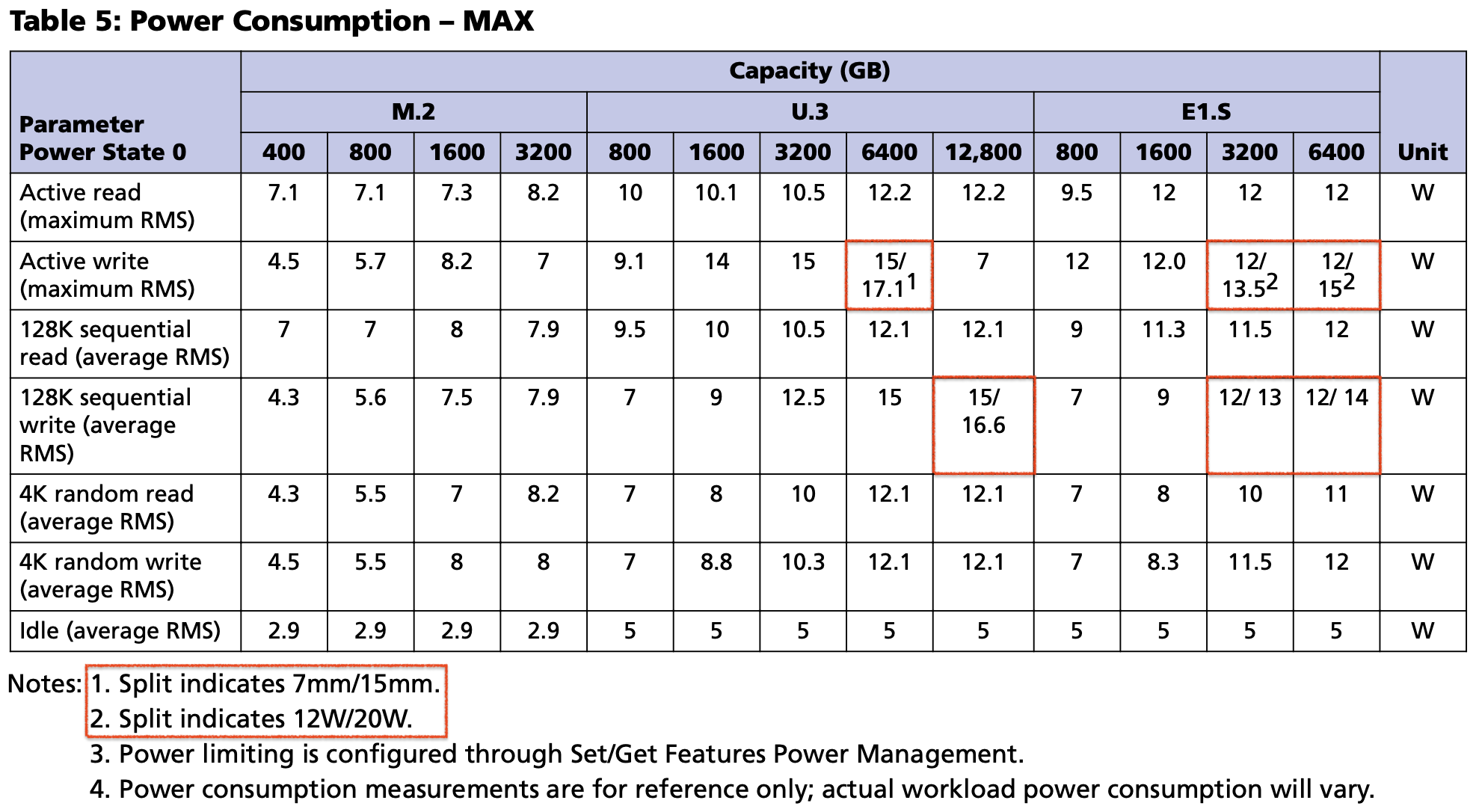 위에서 보여드렸던 성능표를 기억하시나요? U.3는 7mm와 15mm 모델이 있지만, 성능 차이는 언급되지 않았습니다. 대신, 7mm는 15W로 전력 제한이 되었다는 언급이 있었죠. 실제로 전력 소모를 언급하는 표에서 7mm 모델은 전력 소모가 15W로 제한되는 것을 확인했습니다. 전력 차이는 발생하지만, 성능은 동일하다... 직관적이지 않은 결과네요.