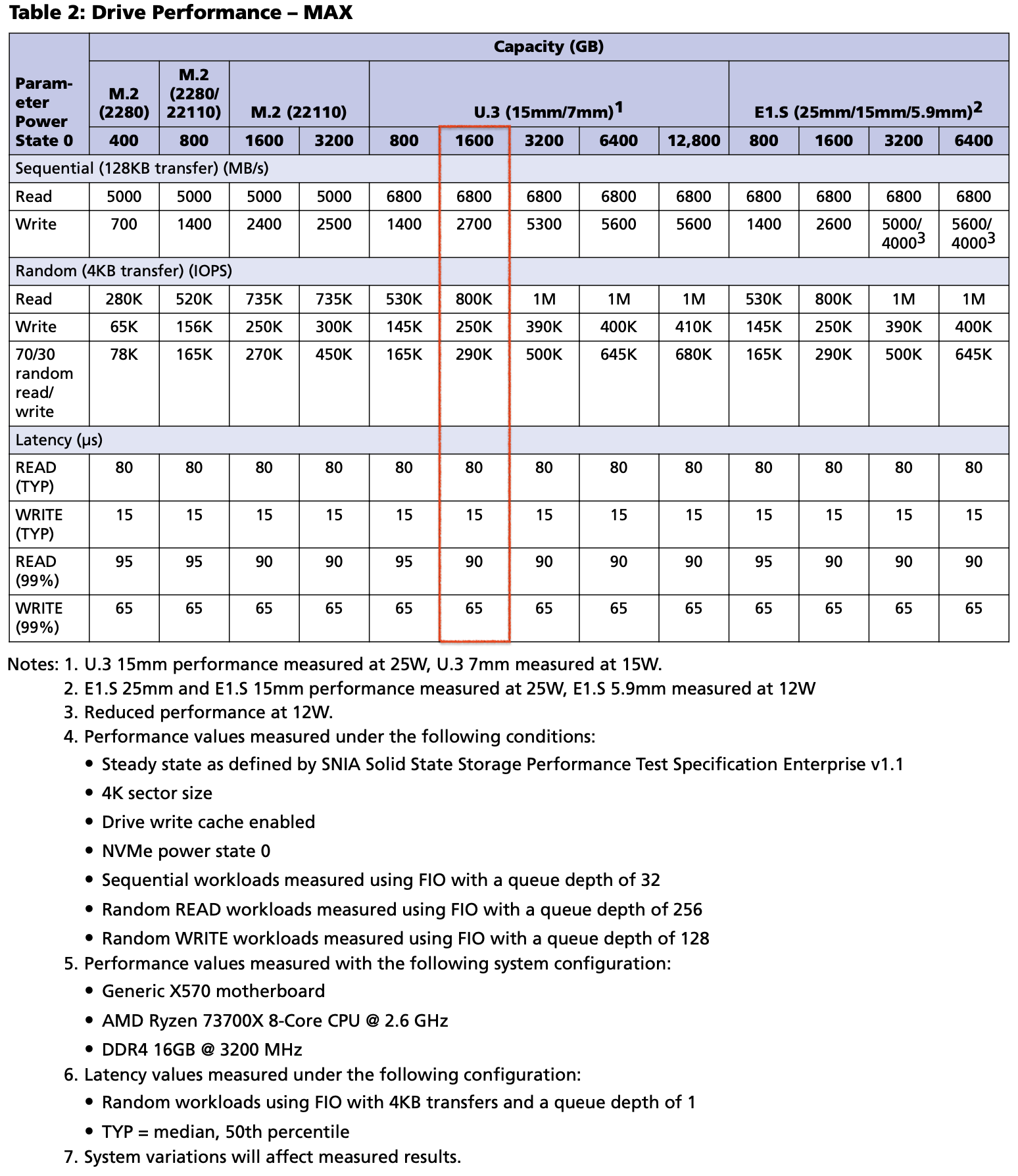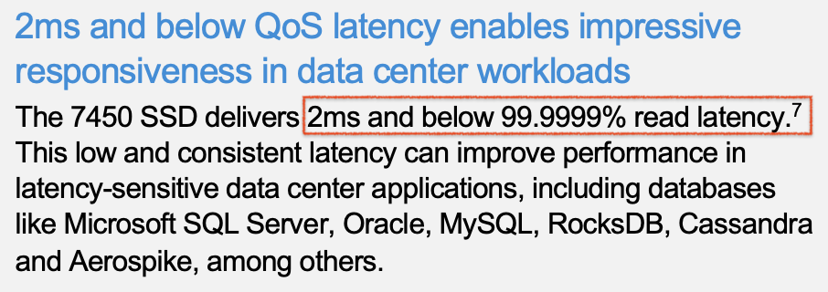 Technical Product Specification에는 언급되지 않았지만, Product Brief에는 2ms 이하의 99.9999% 읽기 지연시간을 보여준다고 자랑합니다.