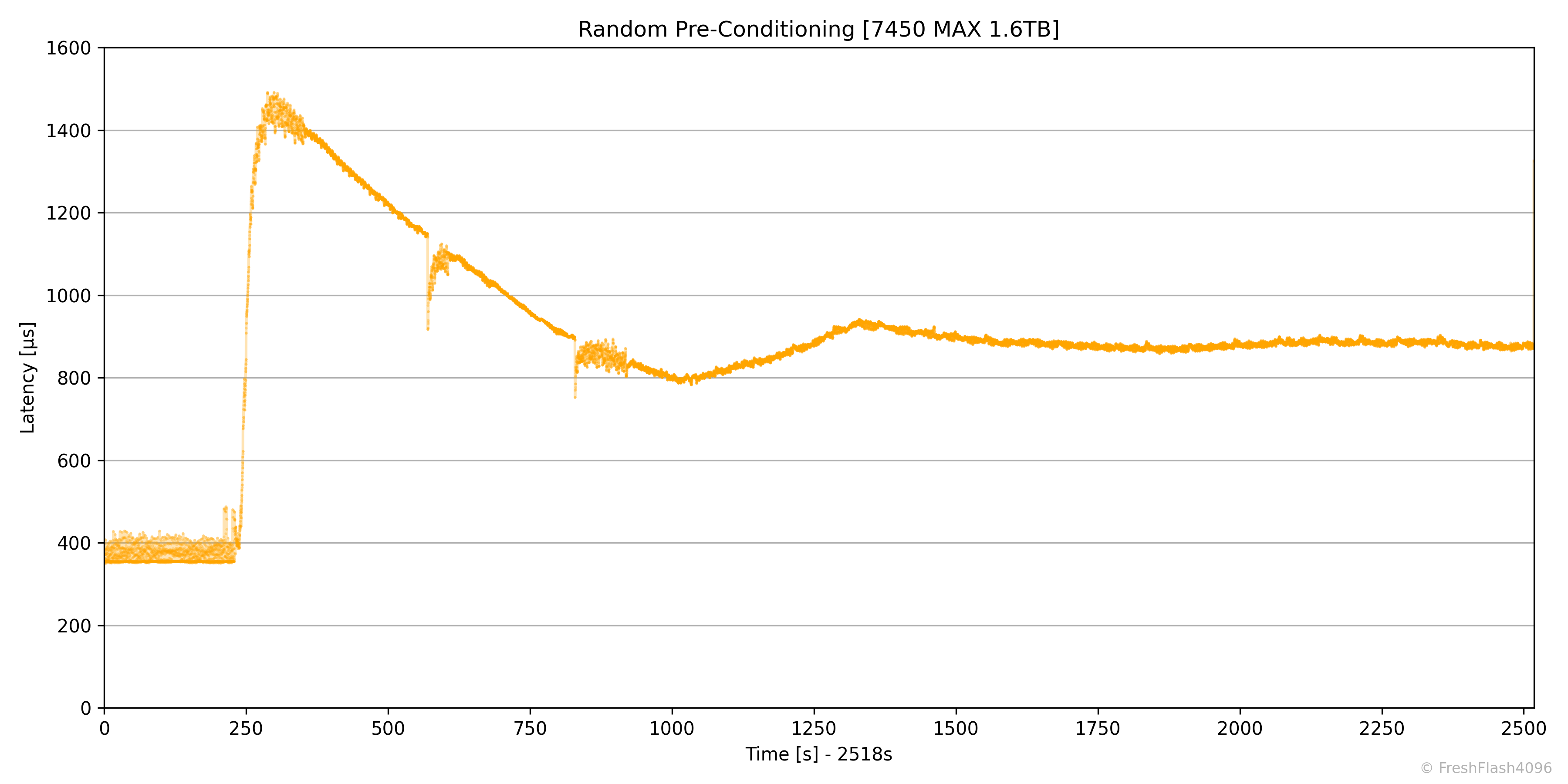 Random Pre-Conditioning은 약 2500초에 걸쳐 진행되었으며, 290k IOPS로 Steady State에 진입했습니다. 상당히 깔끔해 기분이 좋네요.