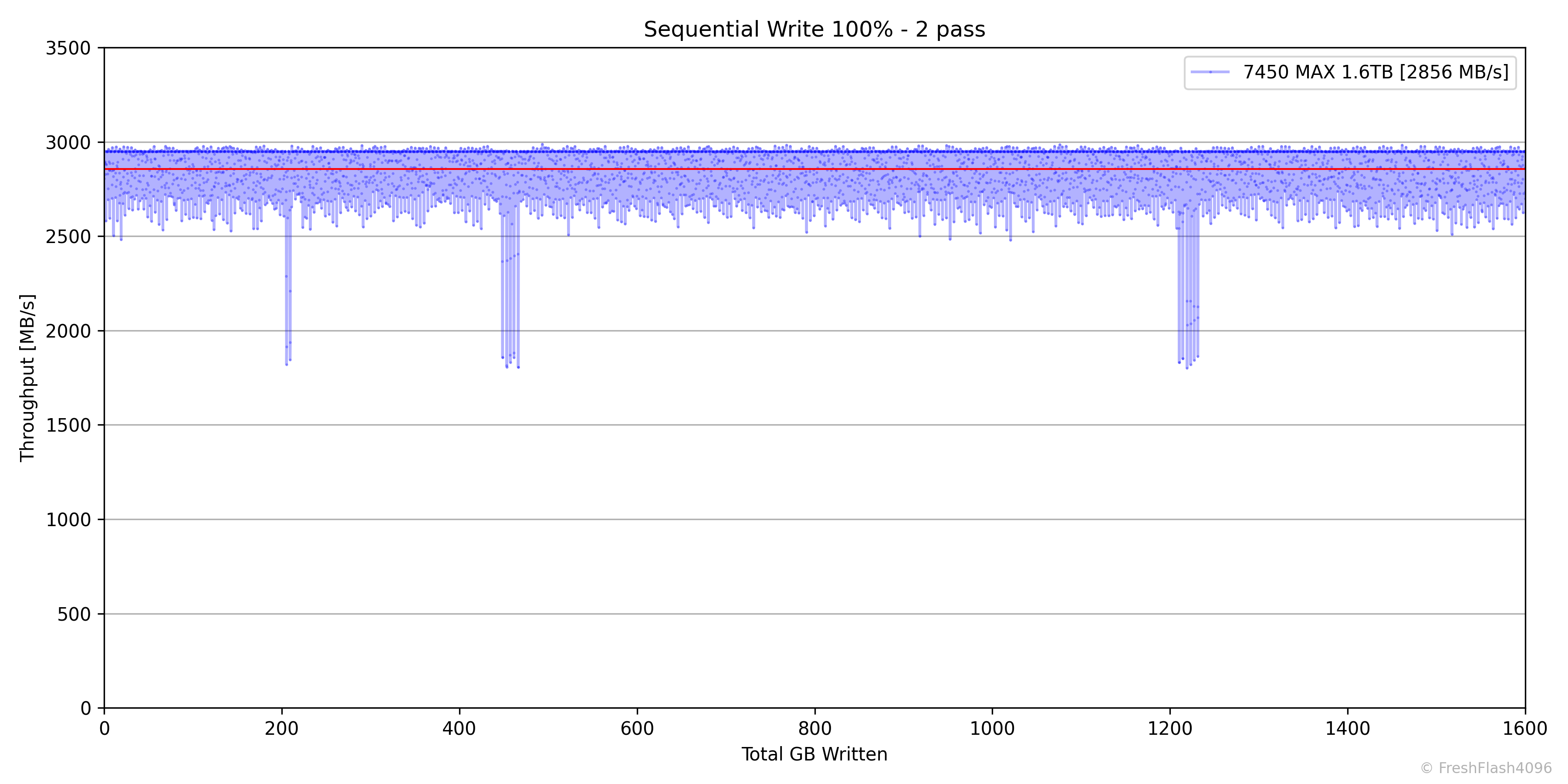 나래온 더티테스트와 비슷한 벤치마크입니다. FOB상태로 시작하여, SEQ 128k QD256으로 드라이브 전체를 2회 채우며, 0.1s 단위로 값을 측정합니다. 1회차와 2회차 사이의 휴식은 충분히 부여됩니다.