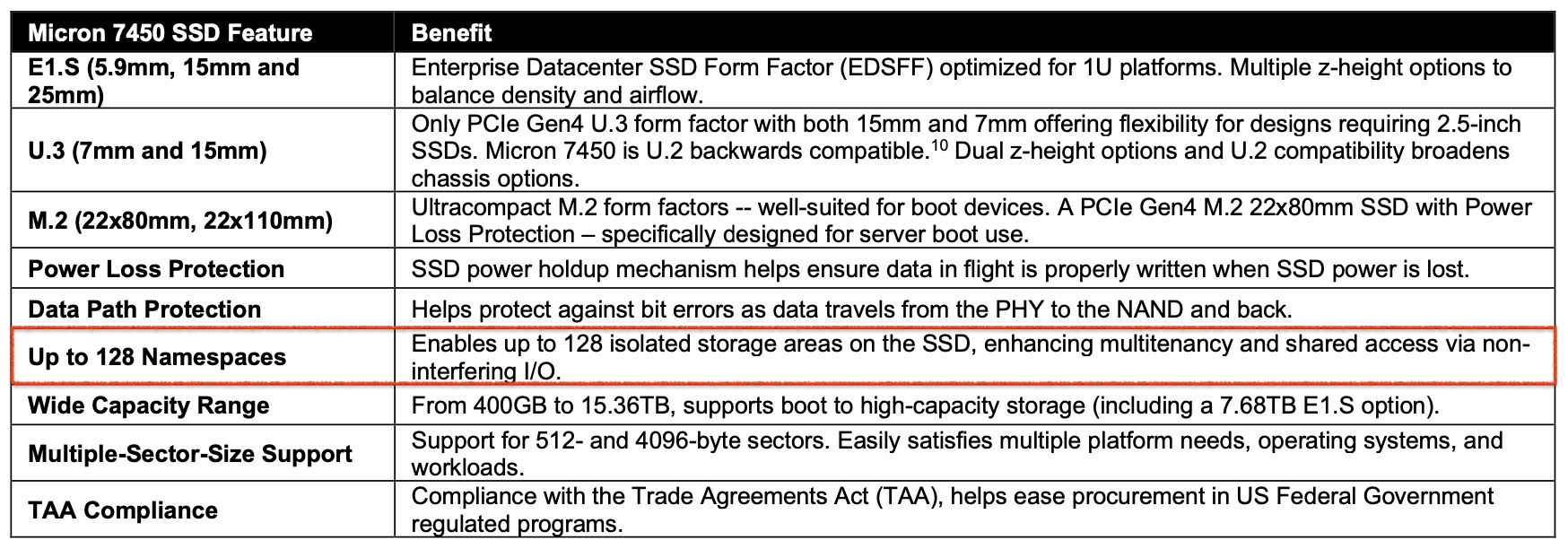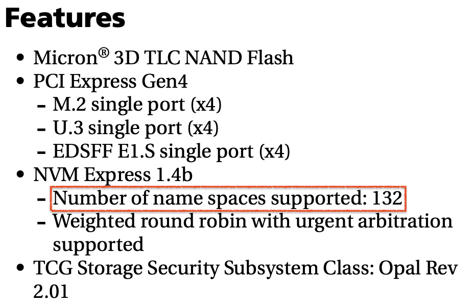 Product Brief에는 최대 128개의 Namespaces를 지원한다고 하였지만, Technical Product Specification에서는 132개라고 보고합니다. 개인 입장에선 100개가 넘는 Namespace를 전부 다룰 일은 적기에 크게 상관은 없지만, 무엇이 옳은지는 궁금한 법이죠.