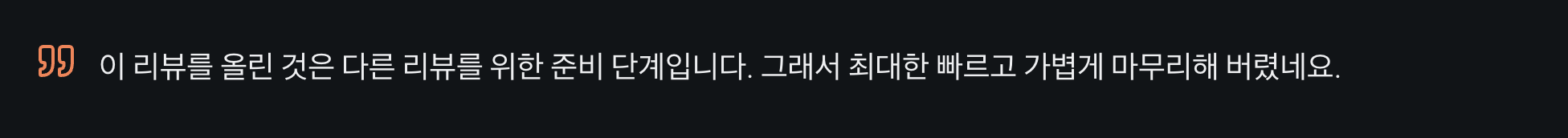 이전에 마무리하며 위와 같은 변명을 했기에, 이번 리뷰는 빠르게 작성을 시작했습니다. 본격적인 시험기간에 들어서면 또 밀릴 것이 분명하니까요.