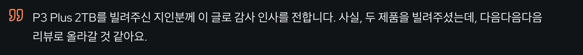 다음 리뷰는 P3 Plus 리뷰에서 언급한 cSSD가 될 것 같네요. 안 그래도 데이터 수집을 마무리한 뒤, 제품을 돌려드린 지 몇 주가 지난 상황이라 올해 안으로는 꼭 투고할 예정입니다.