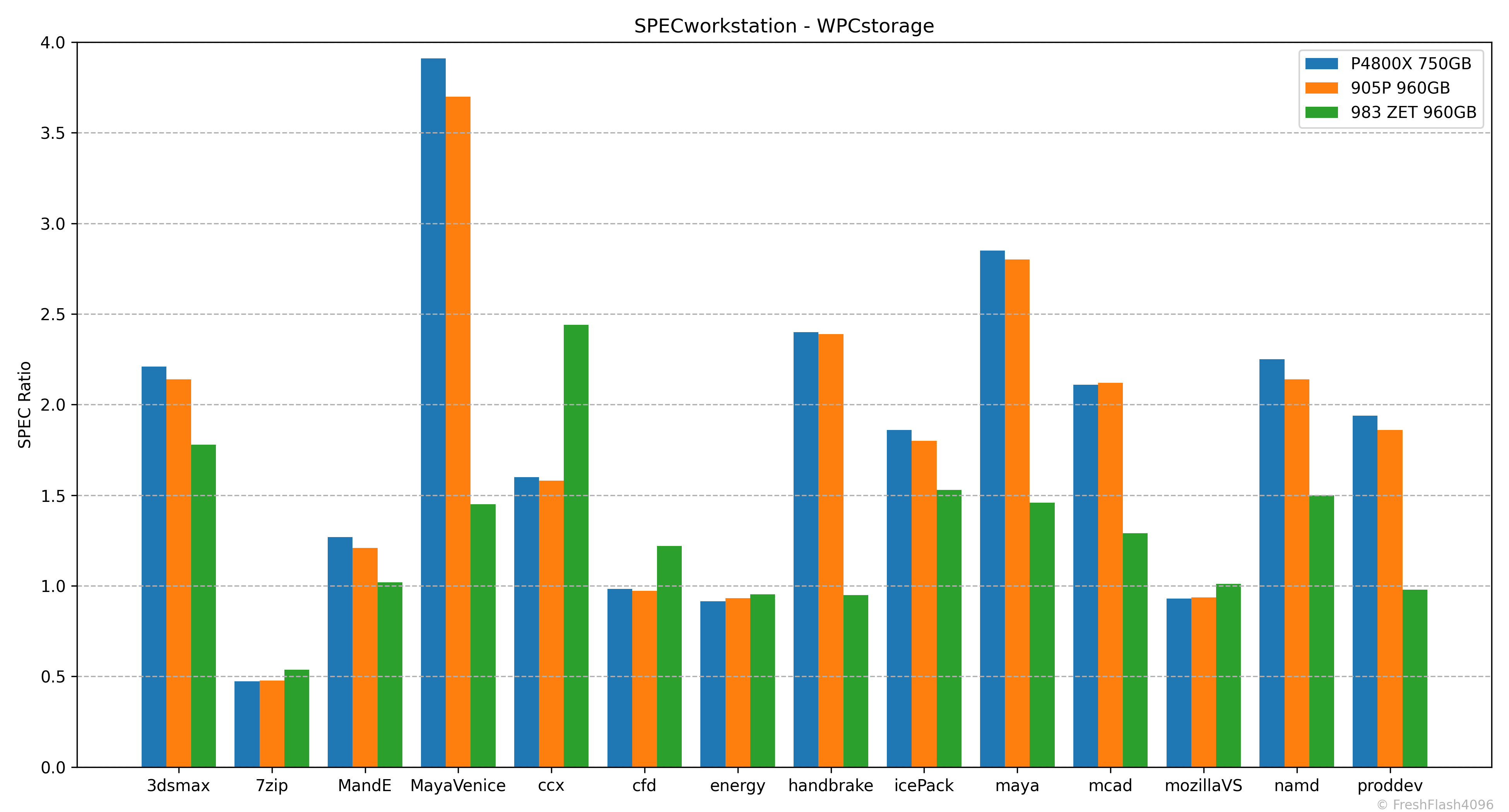 자세한 지표를 둘러보면 7zip이나 ccx, cfd와 같은 일부 워크로드에선 983 ZET가 가장 우수했습니다. 특히, 이 친구들이 1.0을 달성하지 못한 7zip 워크로드가 눈에 띄는데, 당연히 순차 집약적인 작업으로 생각이 되죠?