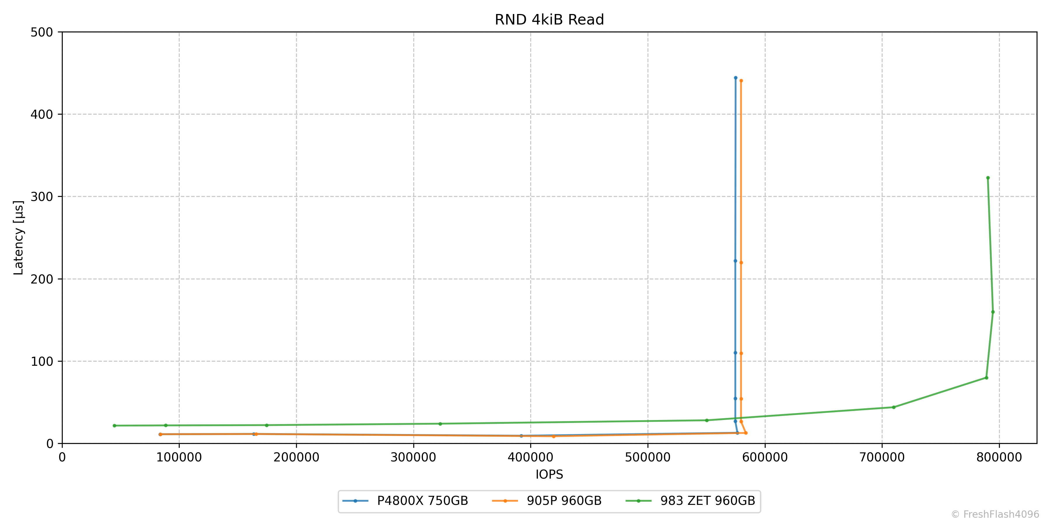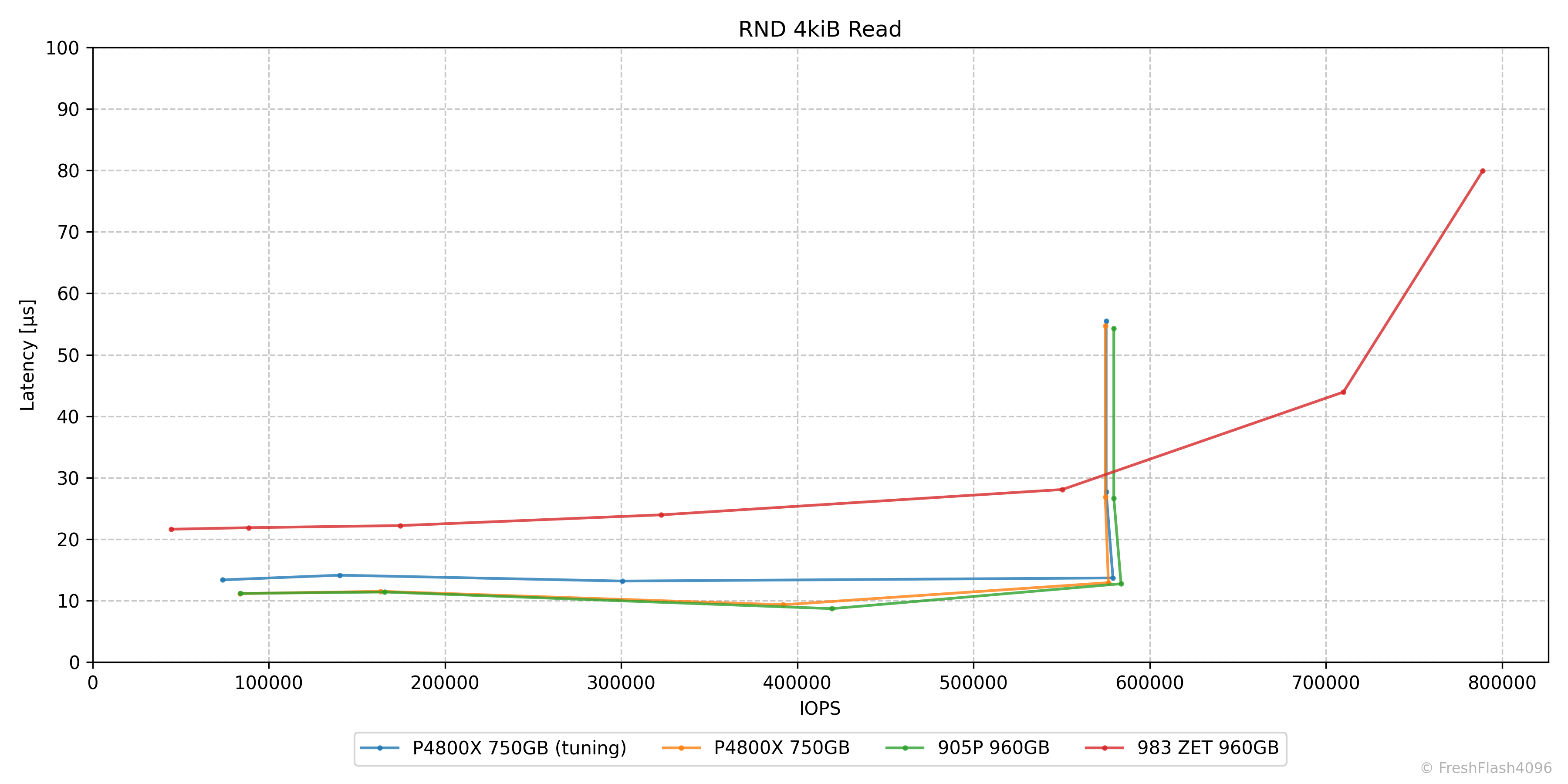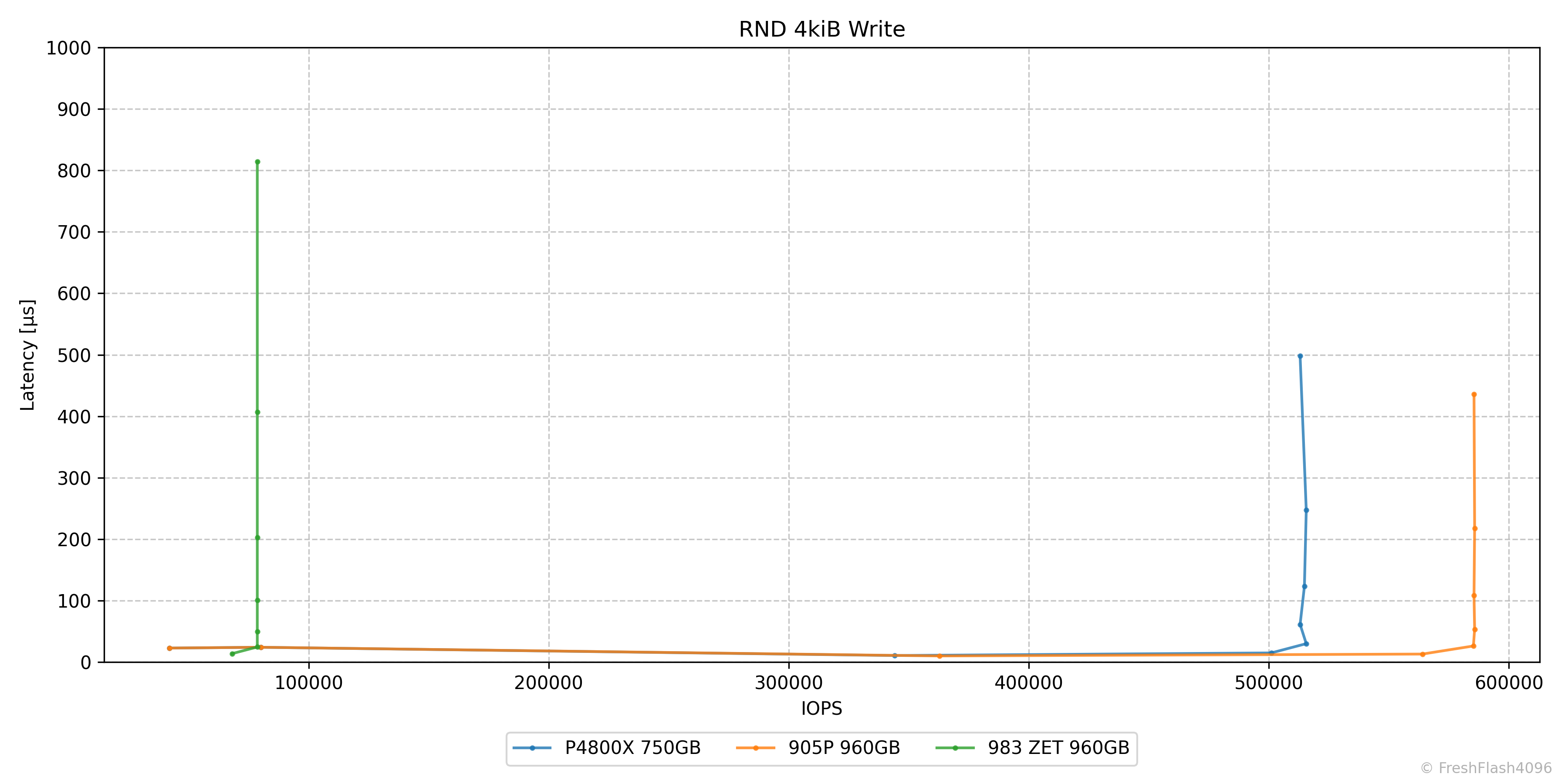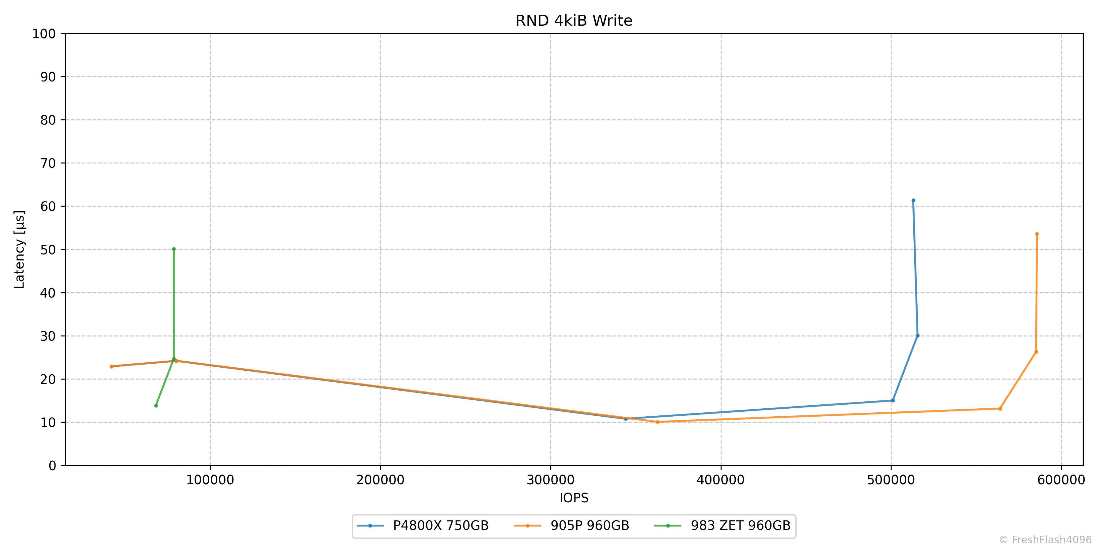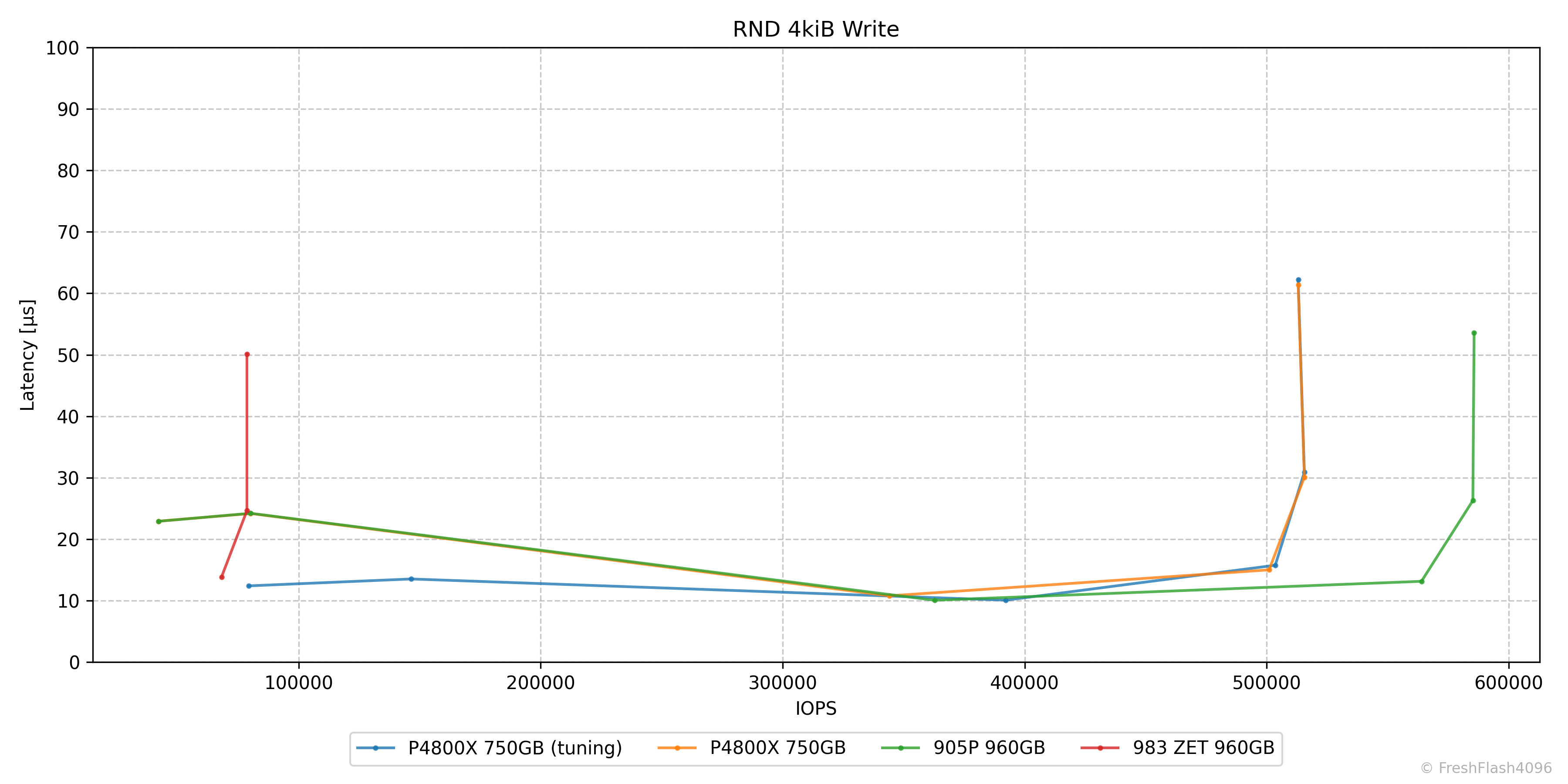 이번엔 랜덤 쓰기 성능입니다. 읽기에선 P4800X가 905P에 약간 밀리는 모습이었는데, 여기선 꽤 차이가 납니다. 거기에 더해, 스펙의 550k IOPS에 못 미치는 것이 확인되었습니다.