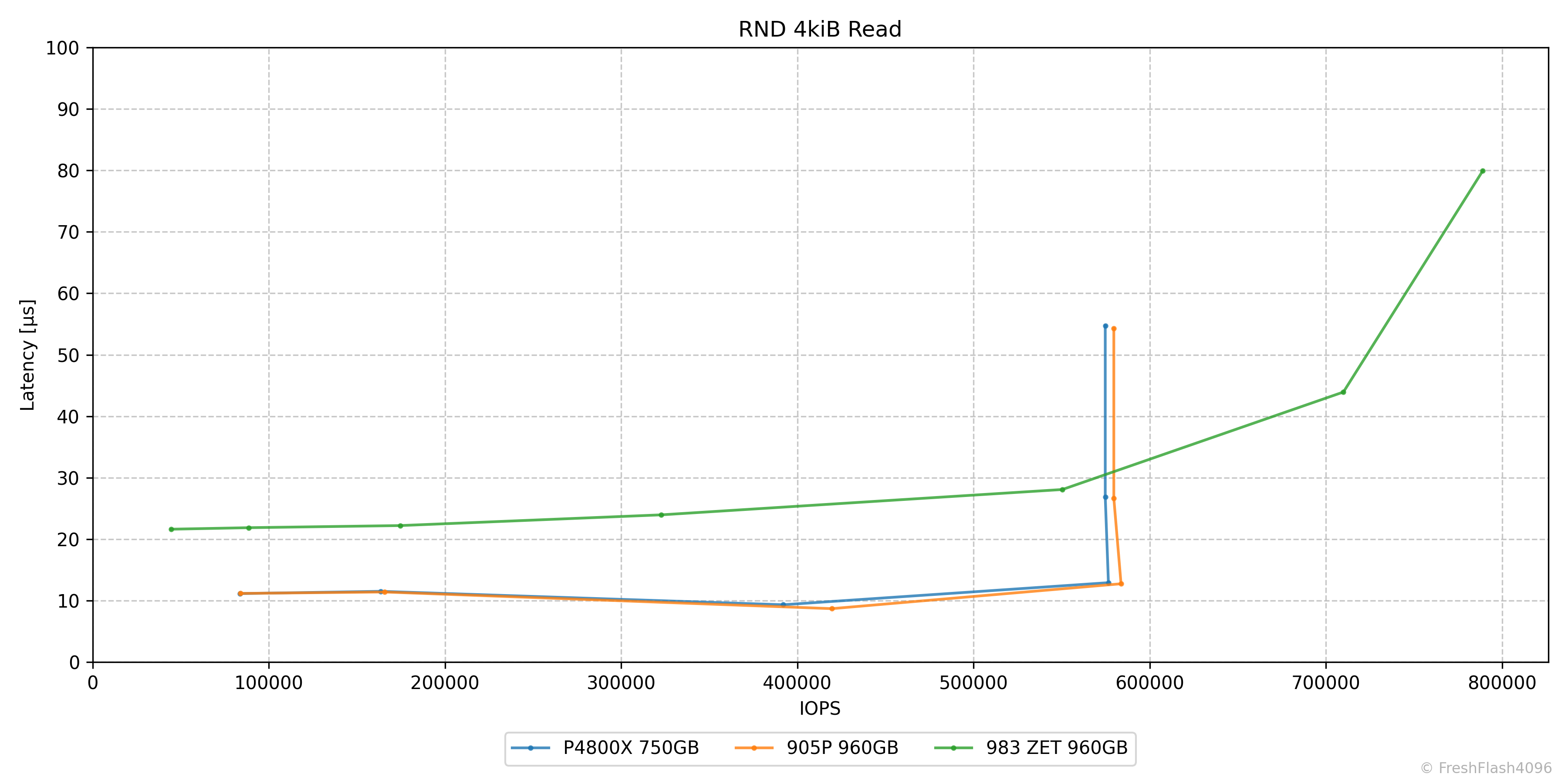 단, 아래의 랜덤 쓰기 성능이 약간 이상합니다. 905P를 잠깐 리뷰할 땐 눈치채지 못했는데, Optane SSD들의 지연시간이 기댓값인 10µs의 2배에 달하고 있습니다.