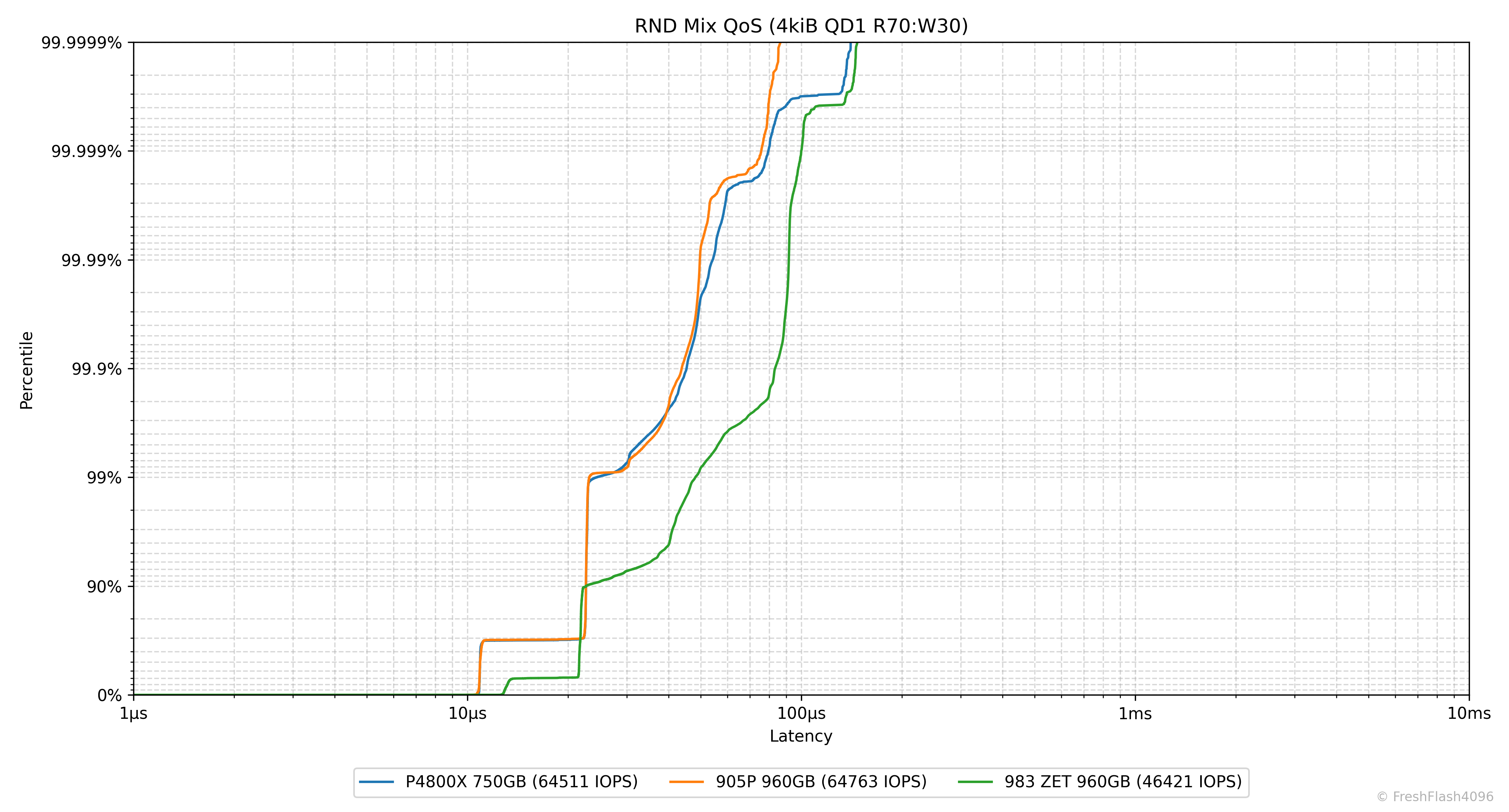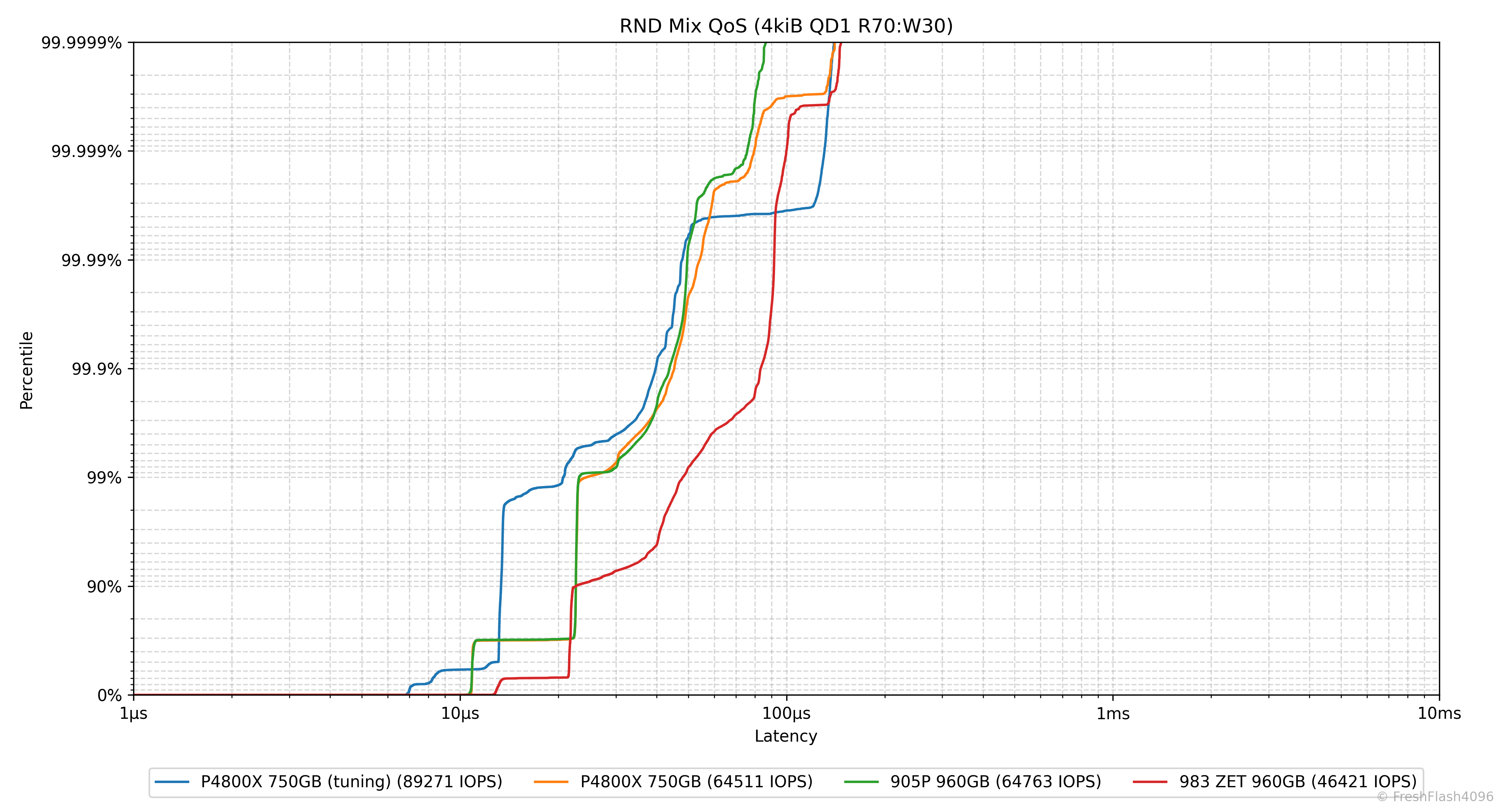 QoS 그래프도 다시 그려보았습니다. 혼합 워크로드에선 10µs 이하의 지연시간도 관측되었네요.