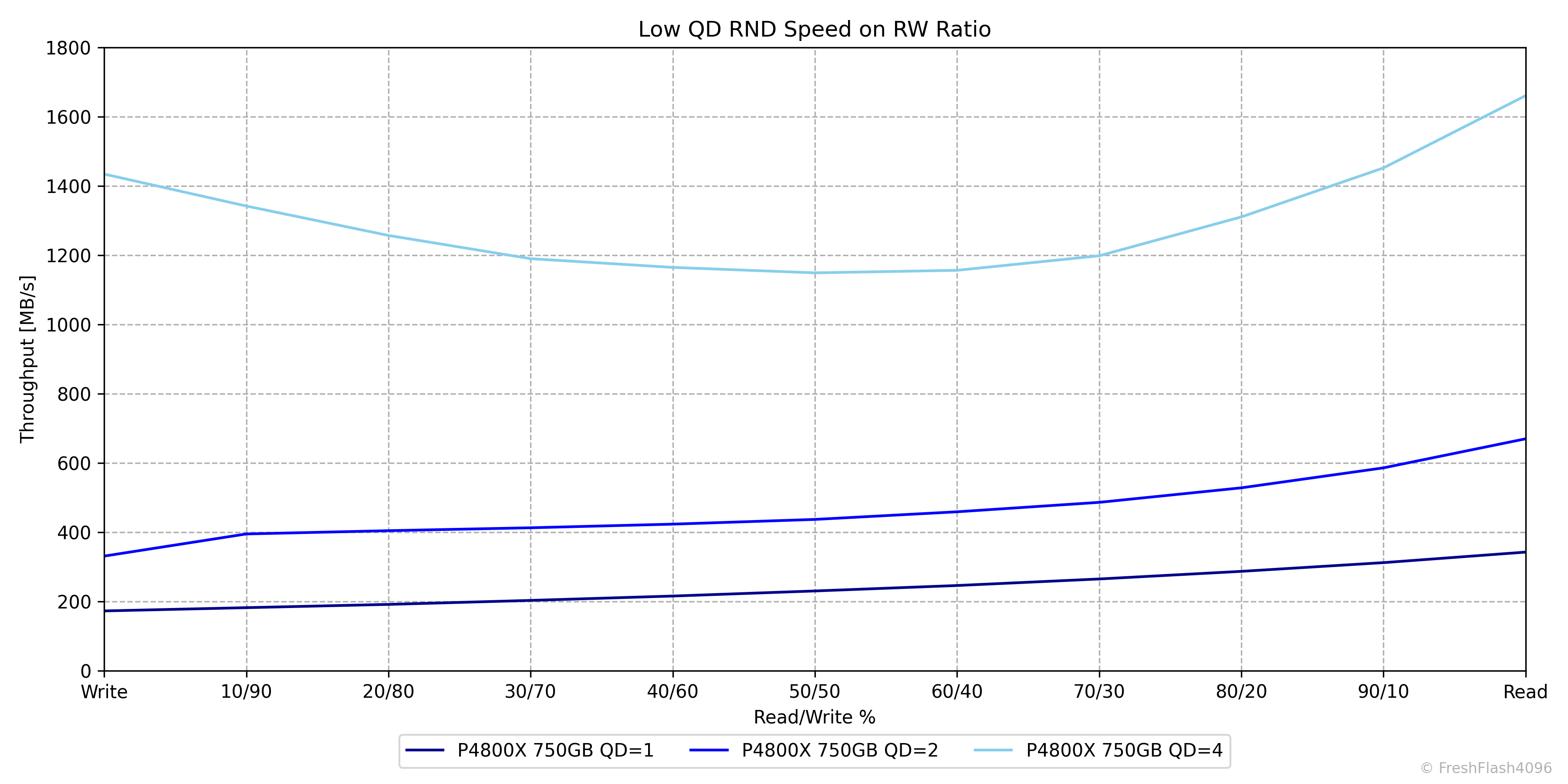 사실, 랜덤 읽기 그래프도 자세히 보면 QD=1과 QD=2 상황에서 지연시간이 늘어졌습니다. 한데, 혼합 성능에선 QD=1 성능이 비교적 정상적으로 보입니다.