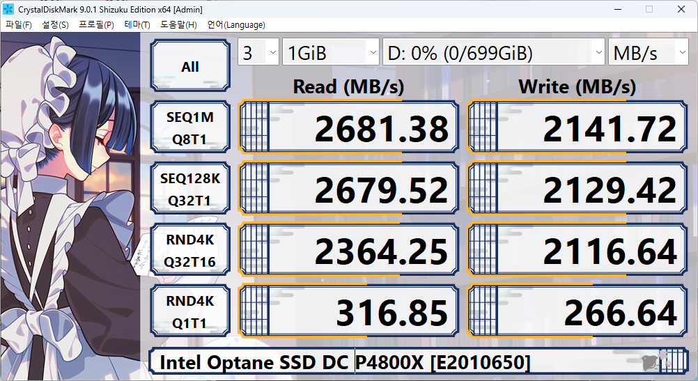 이해는 안 가지만, PM9E1이 5117점이었으니, 공개적으로 보여드린 점수 중에는 P4800X가 1위를 갱신해 버렸군요.