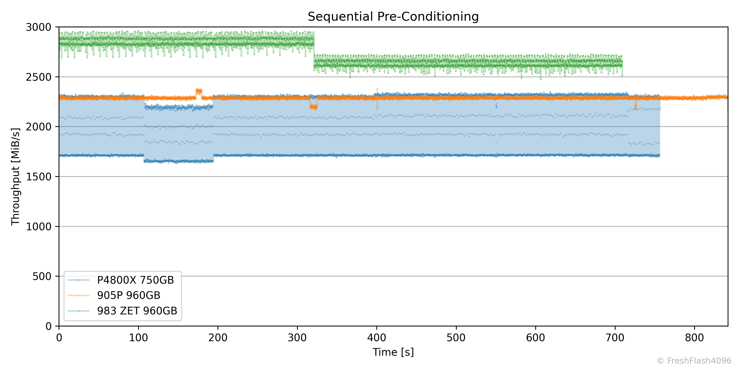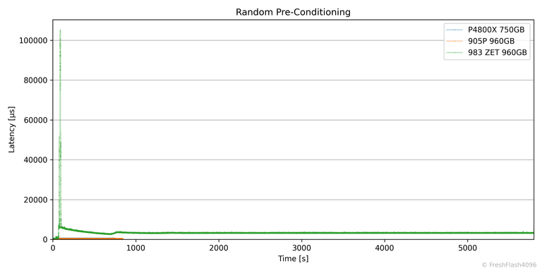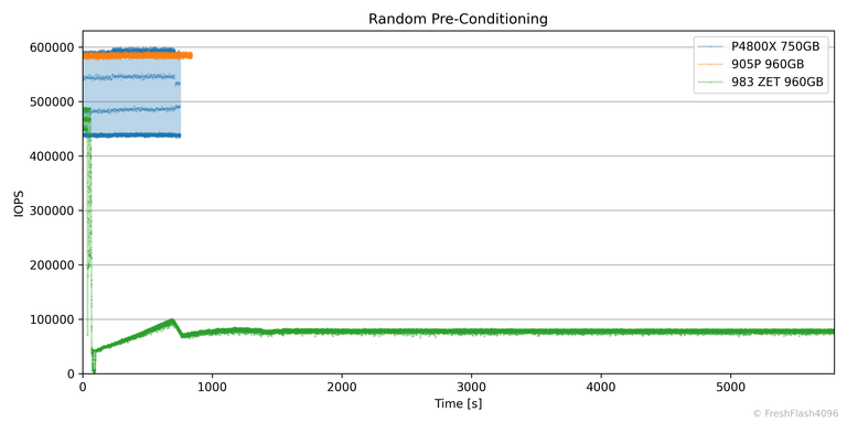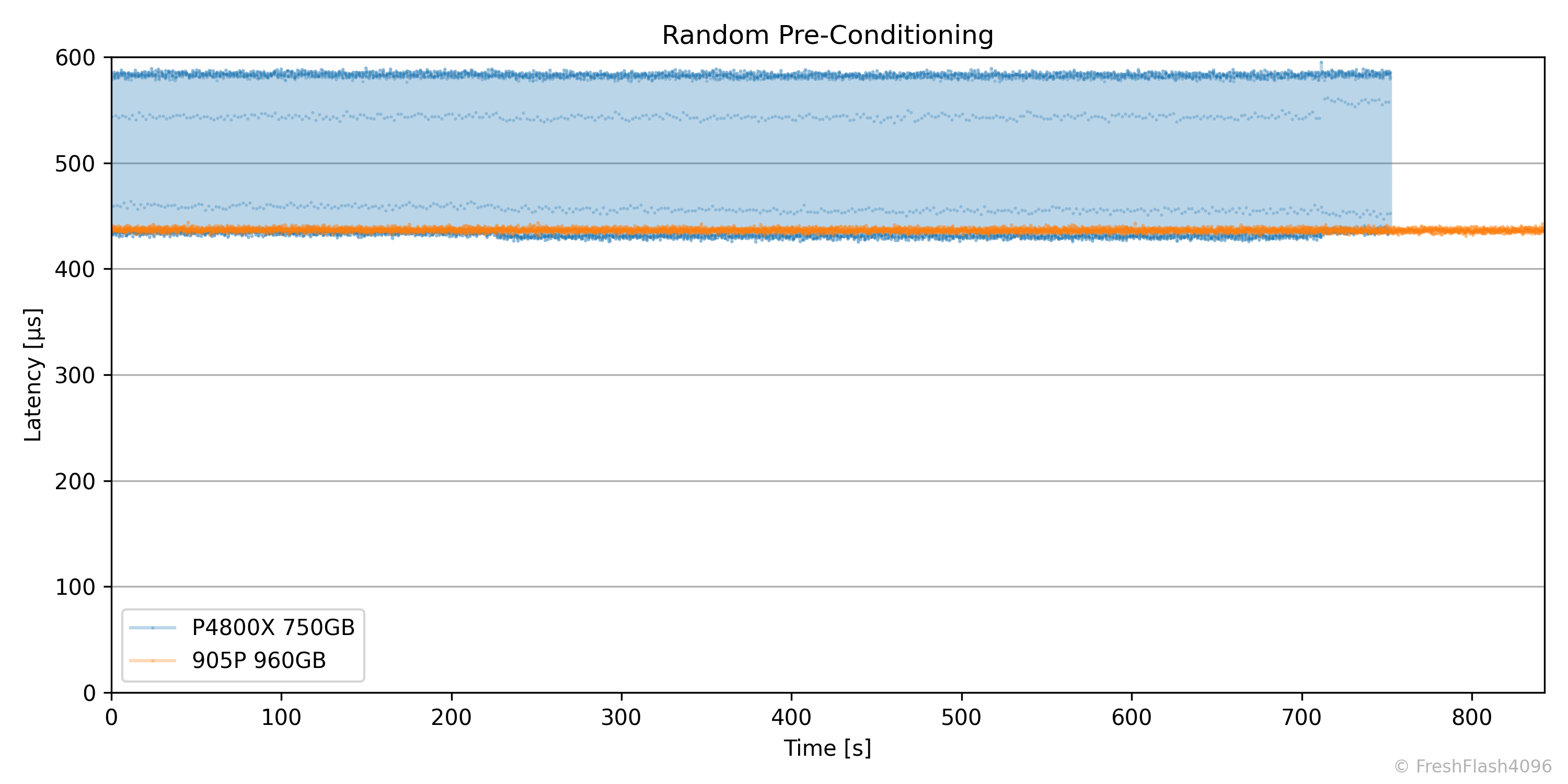 Random Pre-Conditioning도 편차가 심한 것은 매한가지입니다. 하지만 3D XPoint를 저장매체로 하는 만큼, 별도의 Transition 영역이 관찰되지 않습니다.