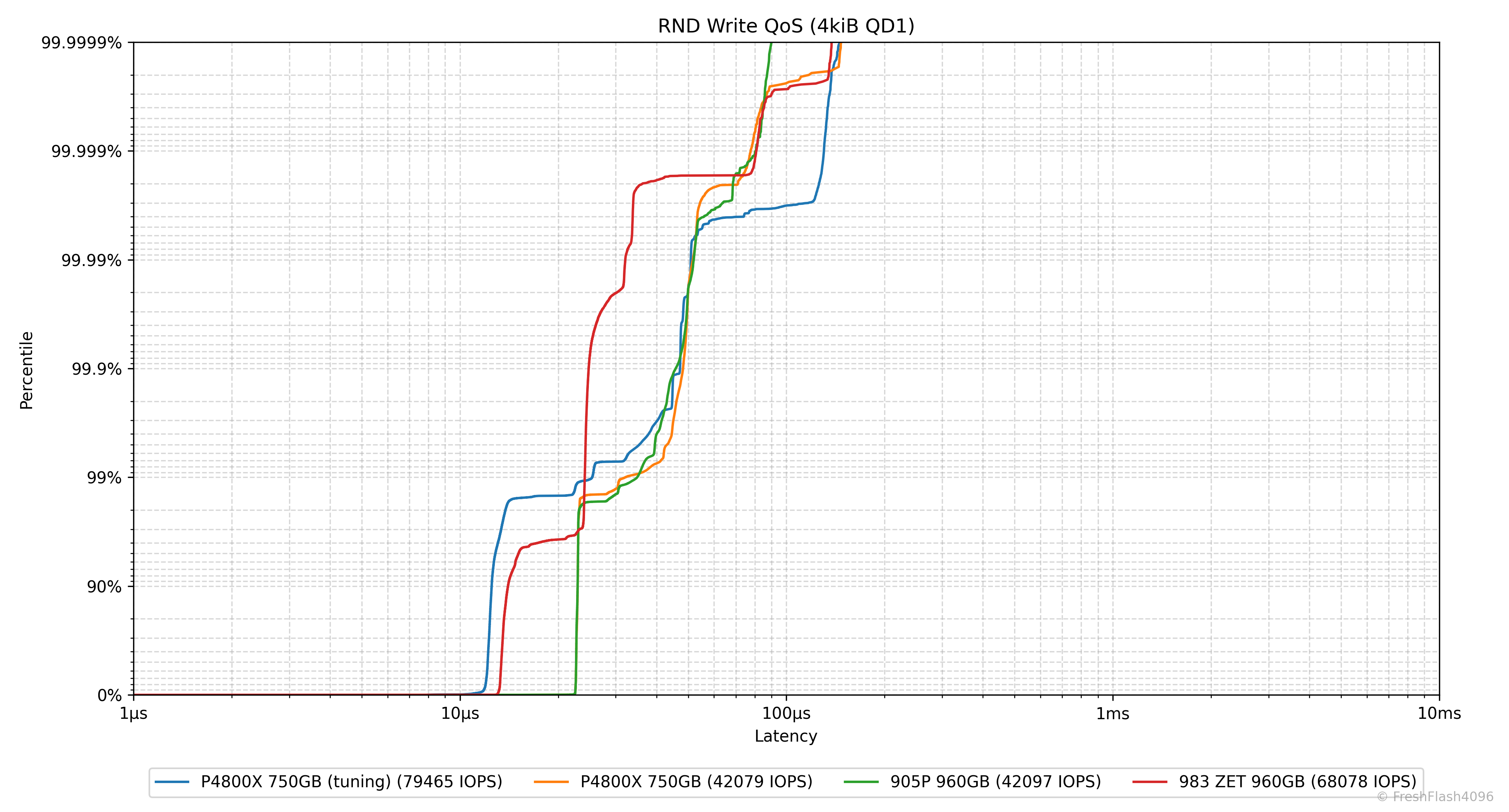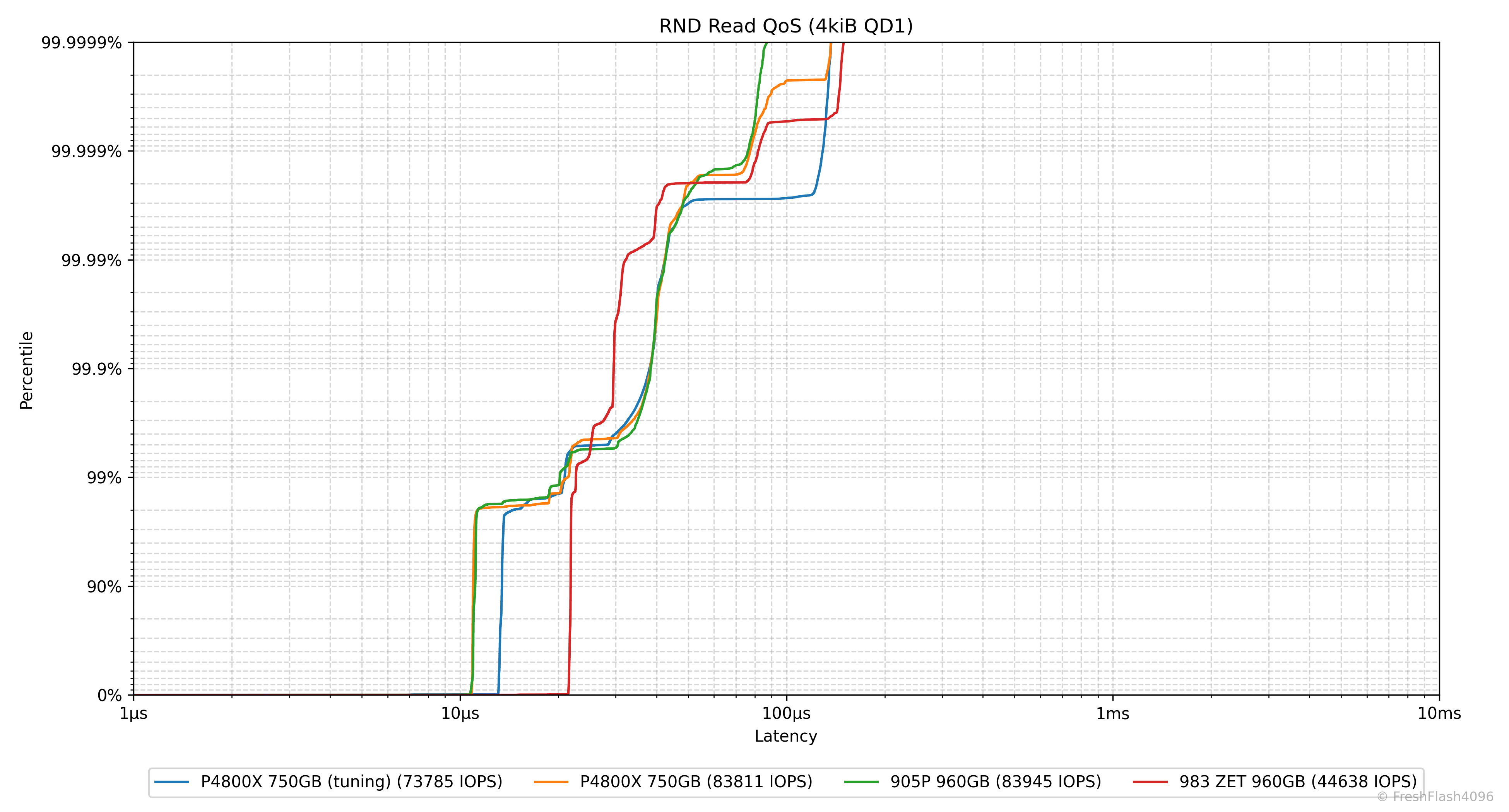 처음엔 다른 것을 확인하지 않고 QD=1 랜덤 읽기 성능만 확인하며 지연시간이 이렇게 늘어지는 것이 AMD 플랫폼이라 그런가 했지만, QD=1 랜덤 쓰기 성능의 뒤처짐, QD=4 지연시간에서 sub 10µs의 달성을 보고 그런 생각은 집어치웠습니다.