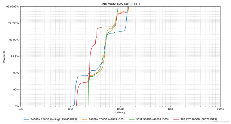 여기서도 읽기와 마찬가지로 100µs로 지연시간을 제한한 그래프입니다. 눈썰미가 좋으신 분들은 이 그래프를 보기 전에 예상하셨을 것으로 생각합니다.