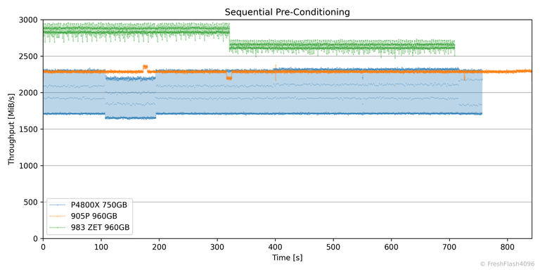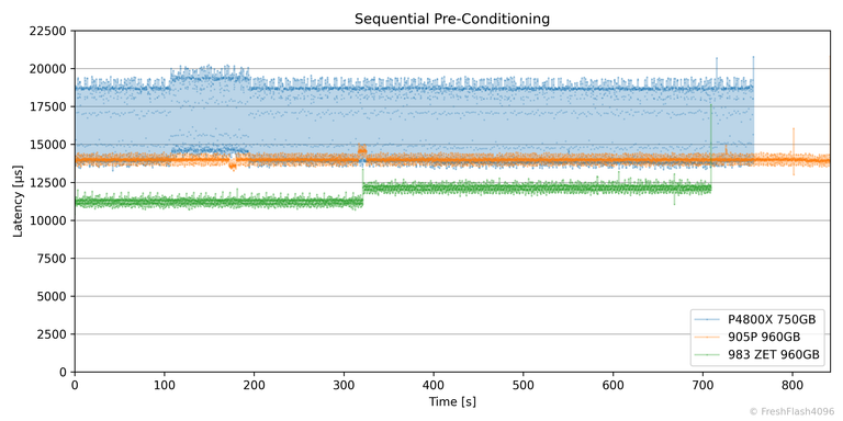 Sequential Pre-Conditioning은 cSSD 벤치마크의 Fill Drive에서 보았던 것처럼 편차가 큰 그래프를 보여줍니다. QD256이라는 환경이라 발생한 문제일까요? 아래에서 다시 얘기해 봅시다.