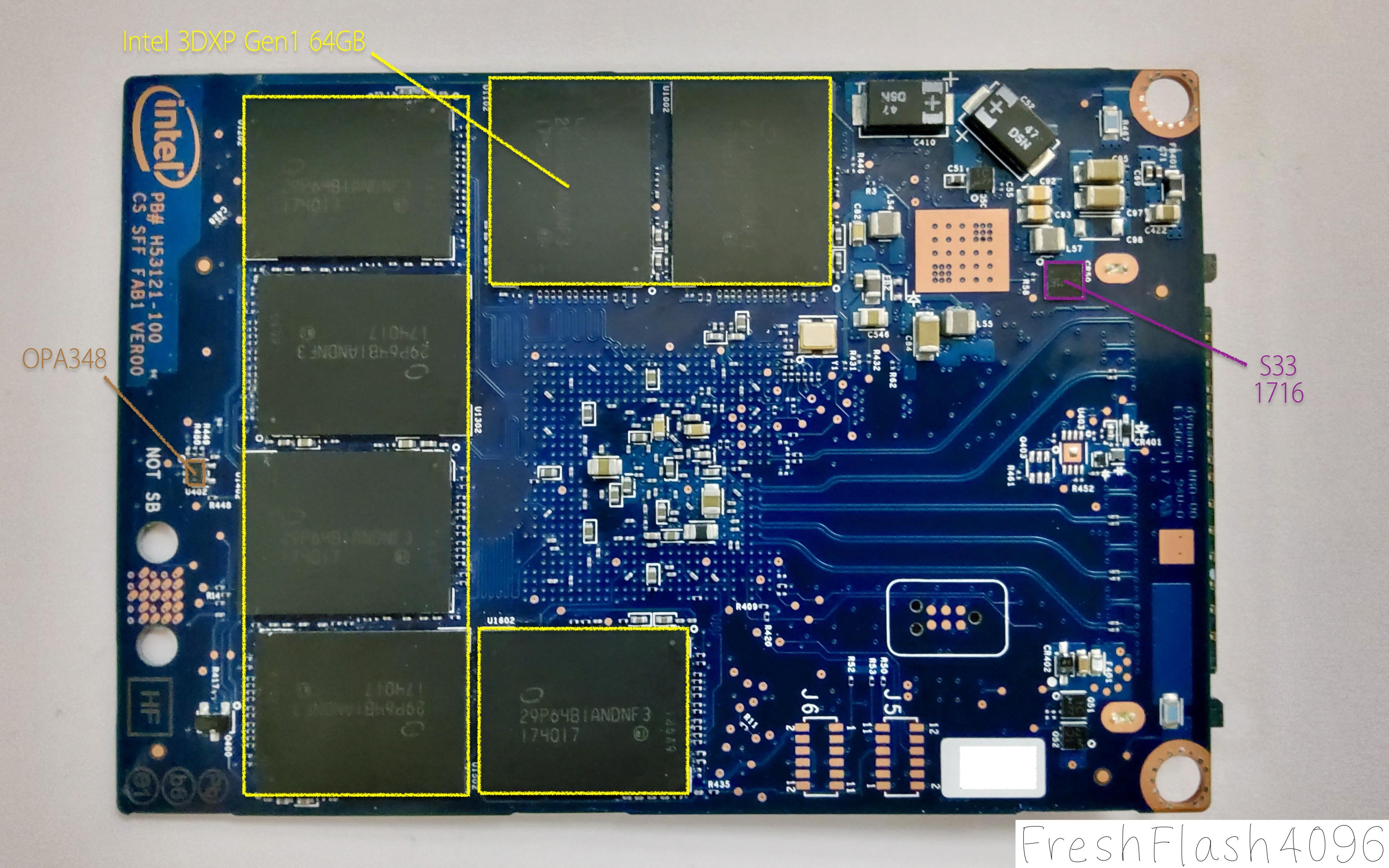 저장매체는 Intel 29P64B1ANDNF3 한 종류로 전면과 후면에 각 7개씩 사용되었습니다. NAND가 아닌 3D XPoint, 1세대의 128Gb Die를 사용했으며, QDP를 통해 칩당 64GB 용량을 구현합니다. 모두 합쳐 1024GB의 Raw Capacity가 구현됩니다.
